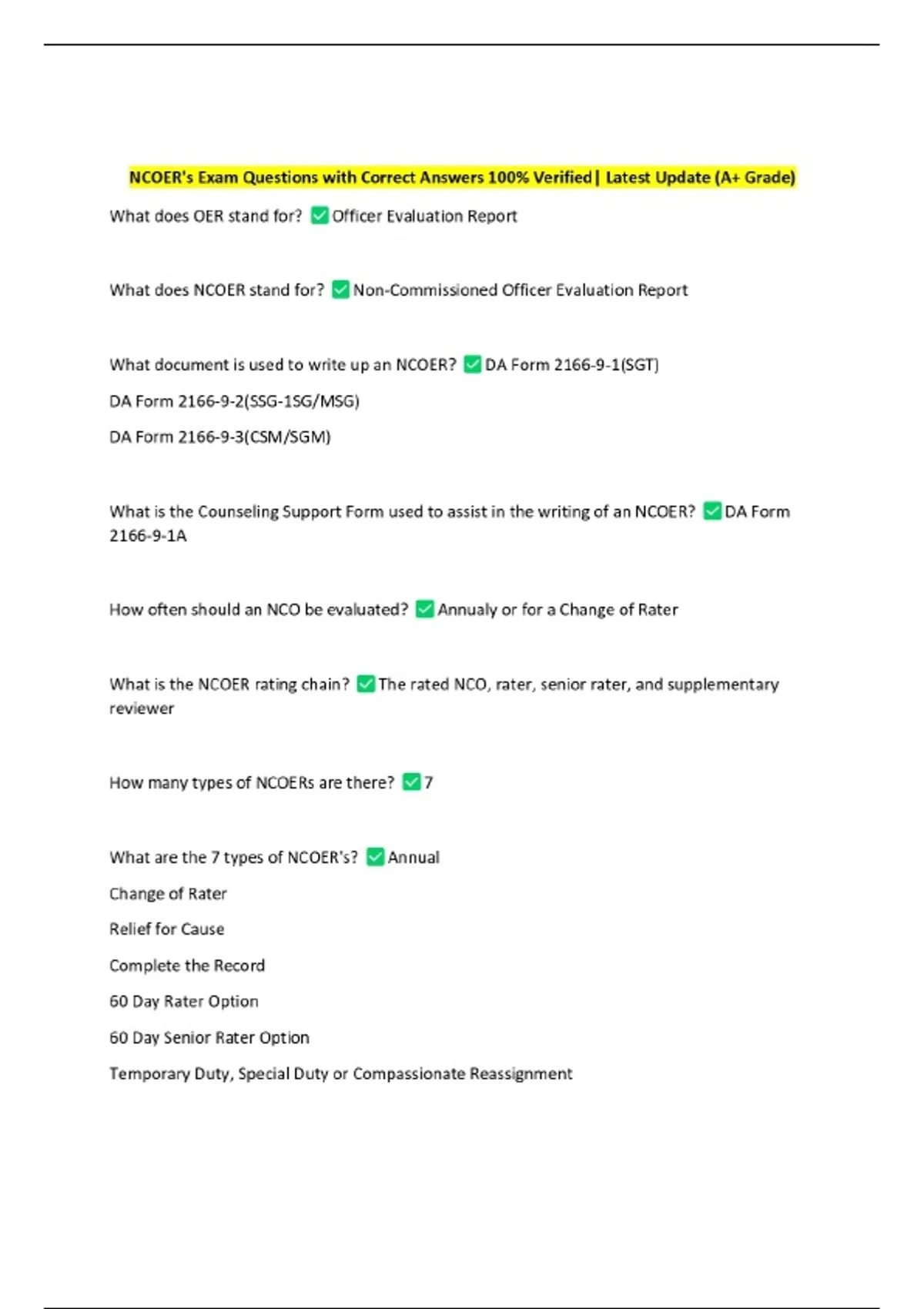 NCOER's Exam Questions with Correct Answers 100% Verified| Latest Update (A+ Grade)