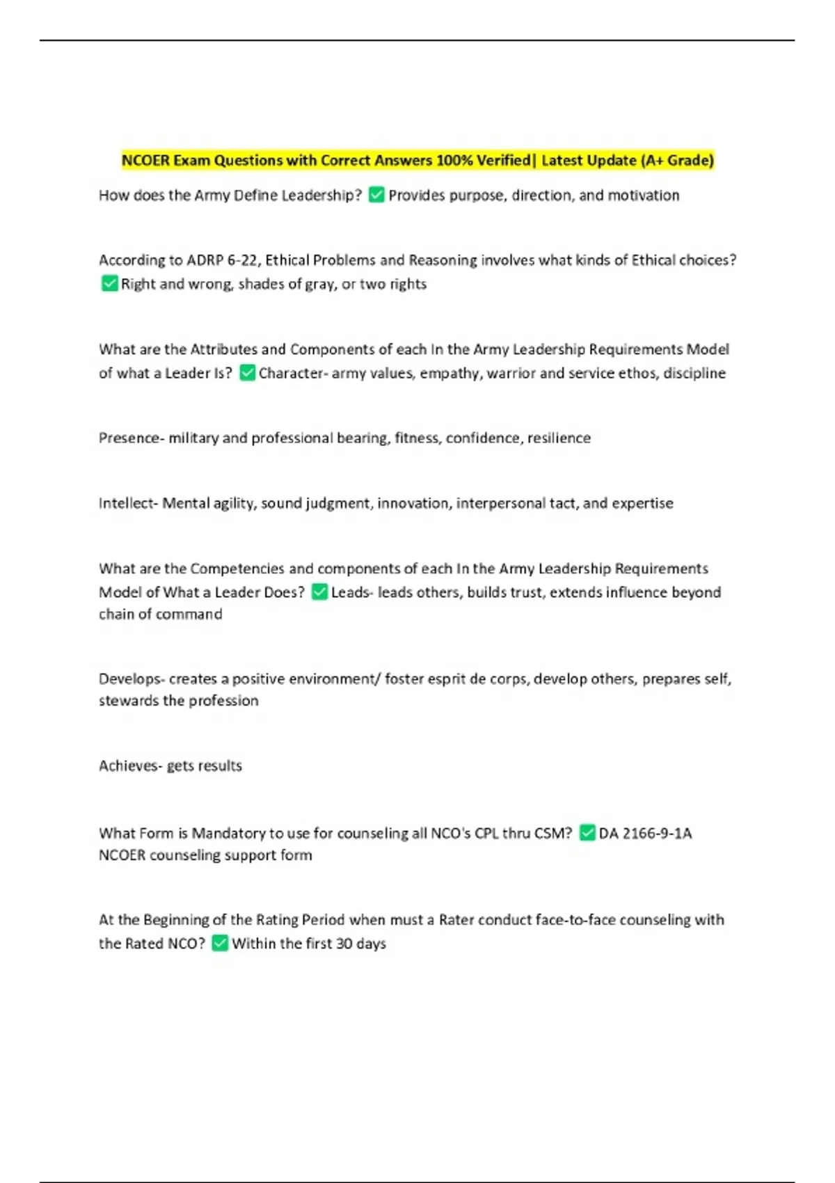 NCOER Exam Questions with Correct Answers 100% Verified| Latest Update (A+ Grade)