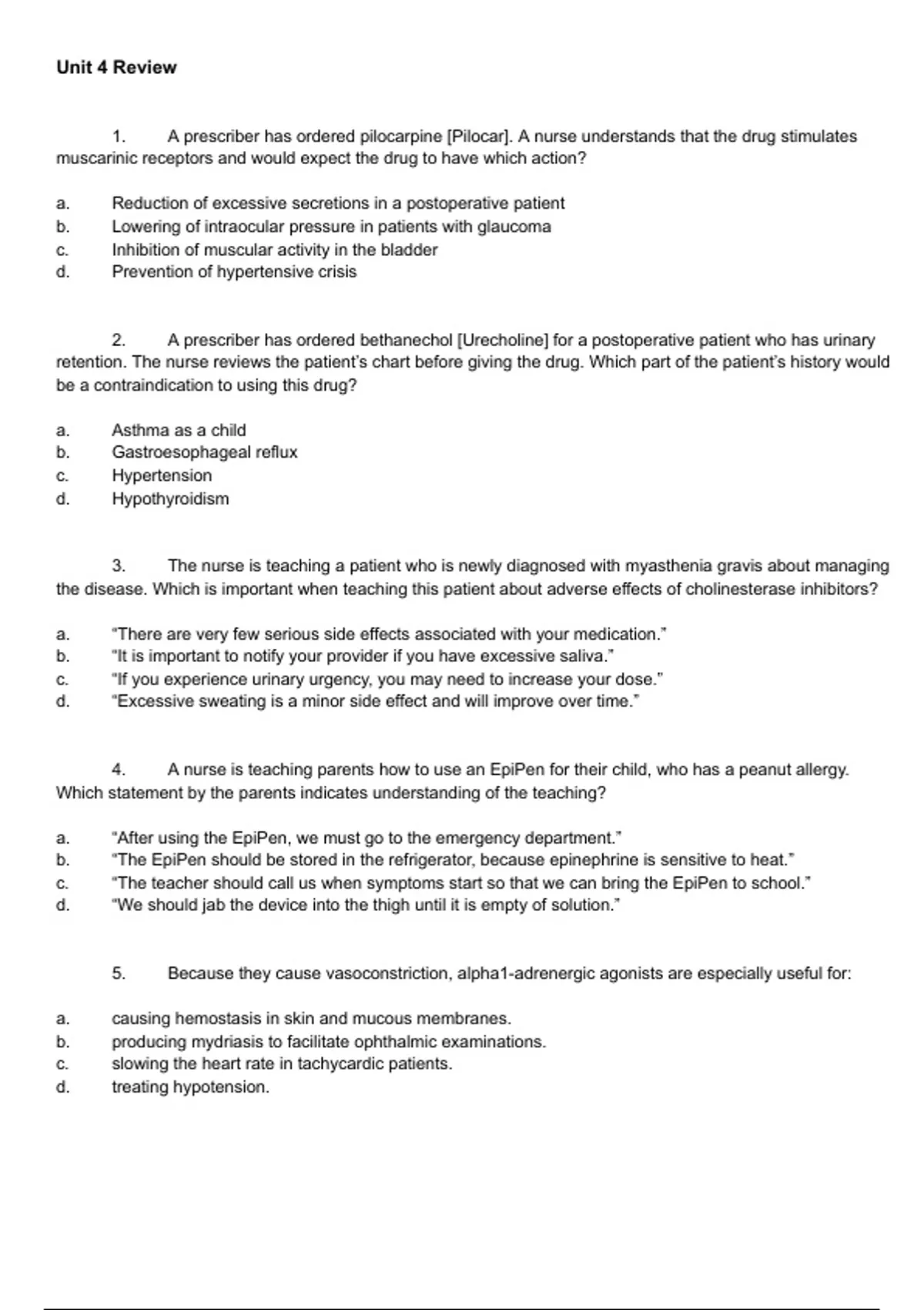 2. A prescriber has ordered bethanechol [Urecholine] for a postoperative patient who has urinary