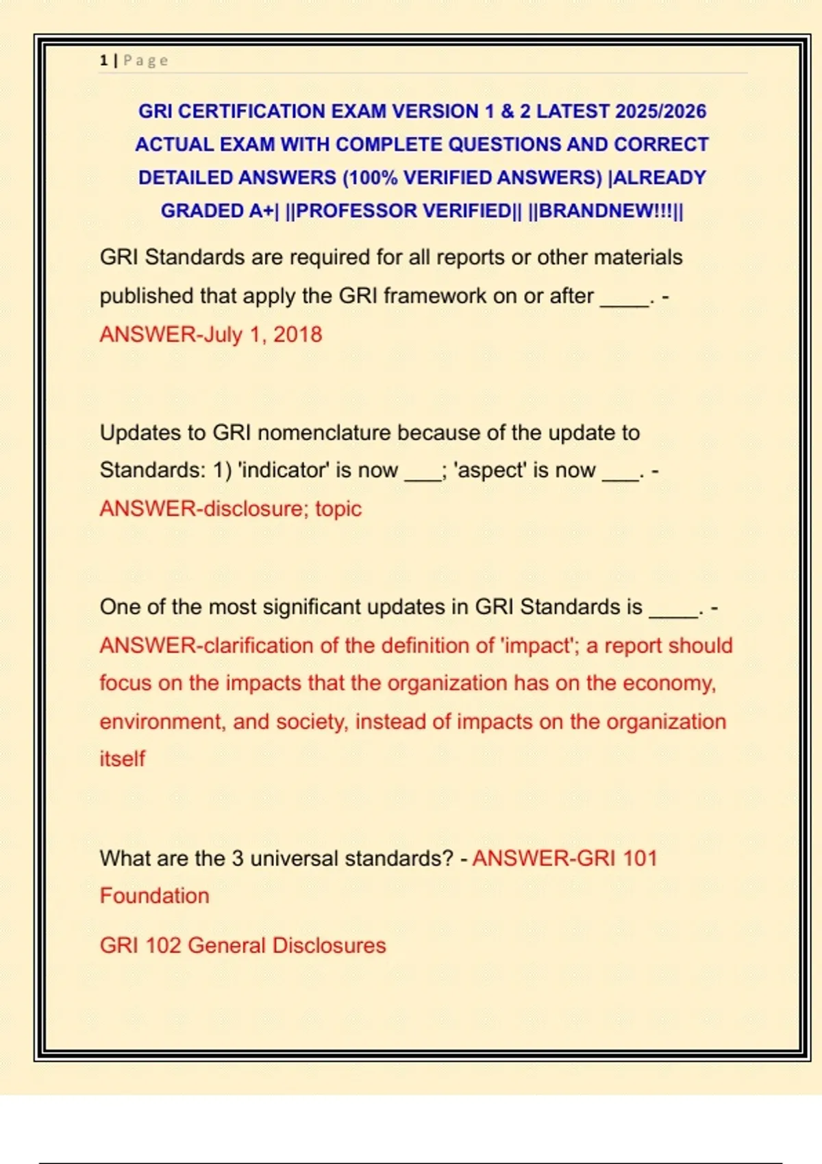 GRI CERTIFICATION EXAM VERSION 1 & 2 LATEST 2025/2026 ACTUAL EXAM WITH COMPLETE QUESTIONS AND CORRECT DETAILED ANSWERS (100% VERIFIED ANSWERS) |ALREADY GRADED A+| ||PROFESSOR VERIFIED|| ||BRANDNEW!!!||