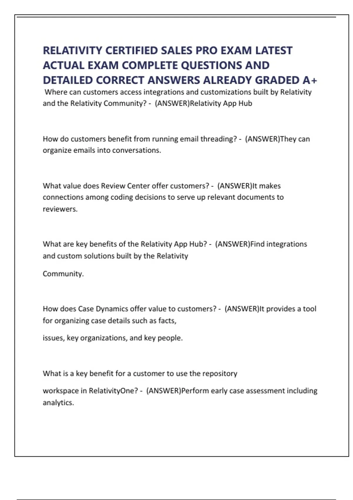 RELATIVITY CERTIFIED SALES PRO EXAM LATEST ACTUAL EXAM COMPLETE QUESTIONS AND DETAILED CORRECT ANSWERS ALREADY GRADED A+