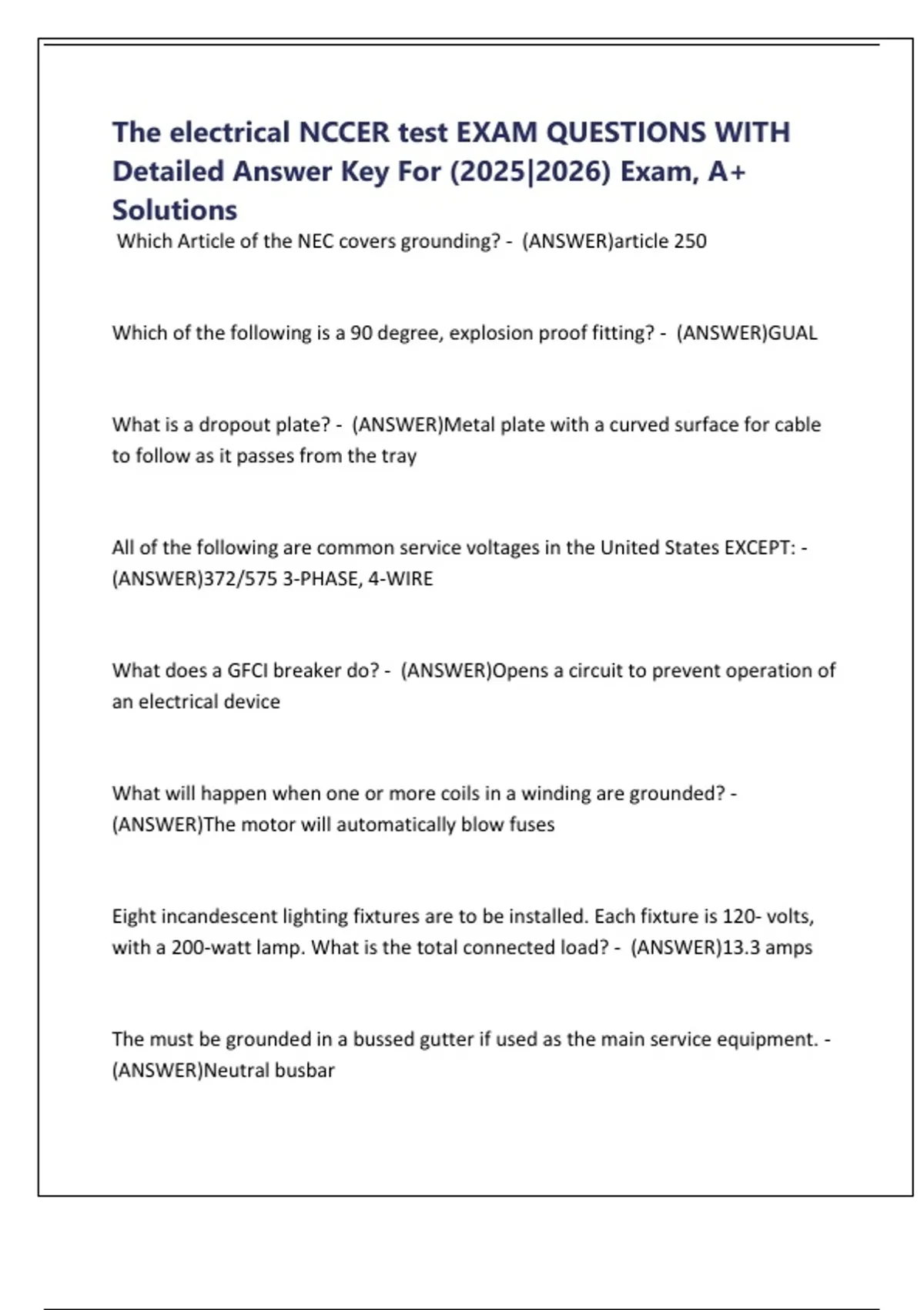 The electrical NCCER test EXAM QUESTIONS WITH Detailed Answer Key For (2025|2026) Exam, A+ Solutions
