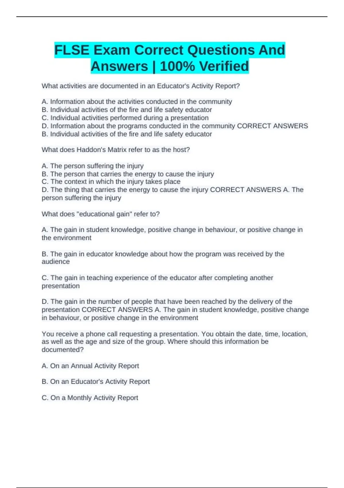 FLSE Exam Correct Questions And