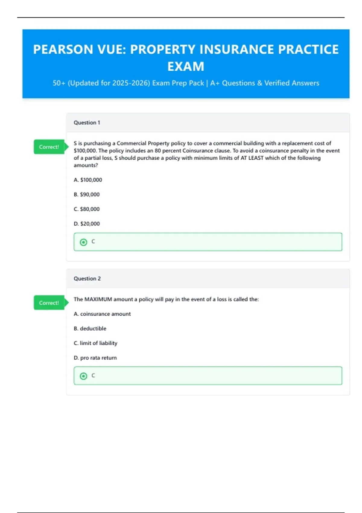 This document features 50+ verified practice questions and answers for the Pearson VUE Property Insurance Exam, covering key topics such as insurable interest, policy structure, endorsements, deductibles, claims handling, and property valuation methods. It includes scenario-based questions and correct solutions aligned with current insurance regulations and exam standards.