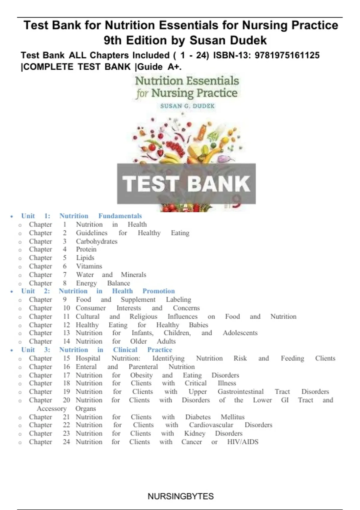 Test Bank: Nutrition Essentials for Nursing Practice, 9th Edition by Dudek - Chapters 1-24, 9781975161125 | Rationals Included