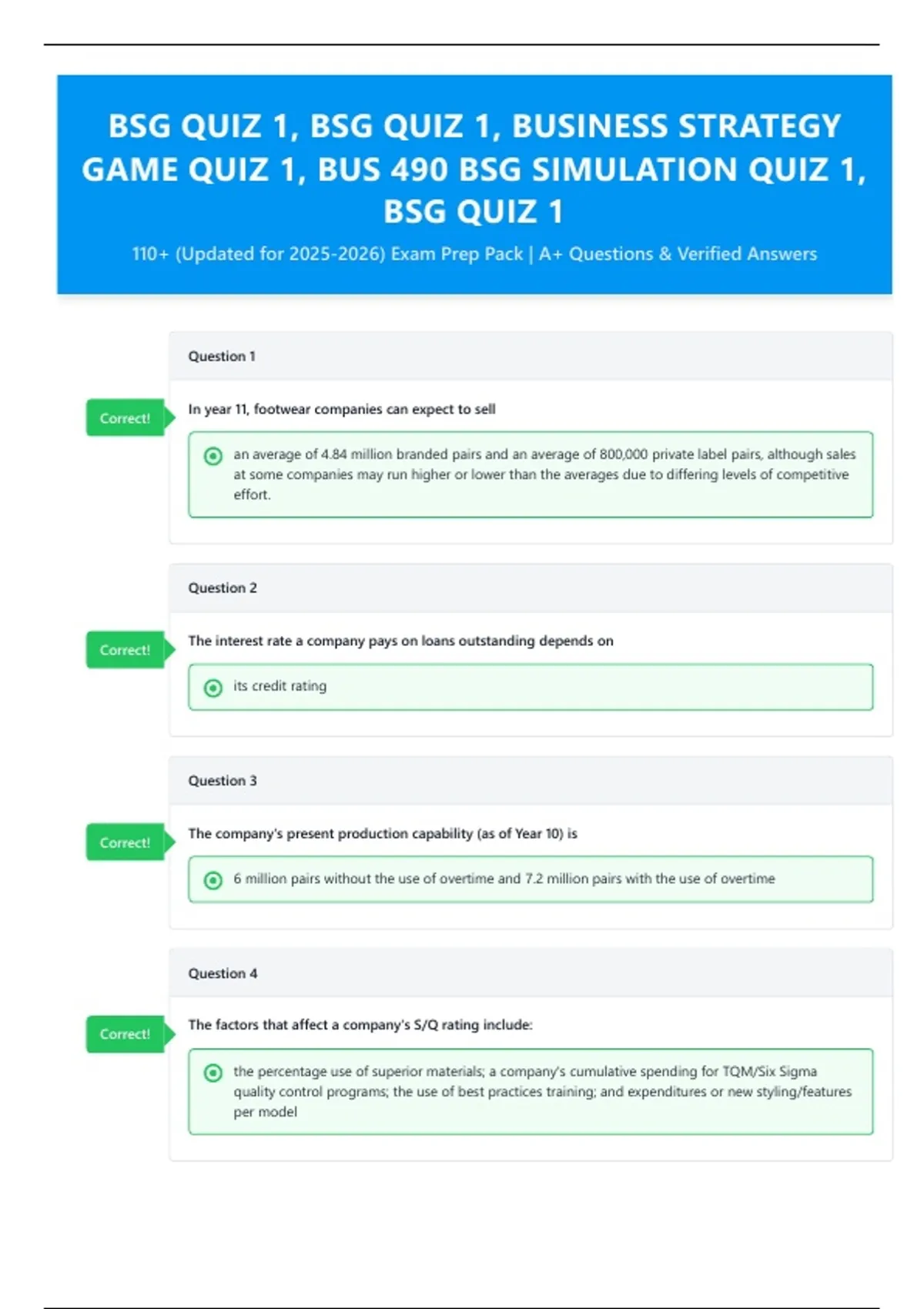 This document contains over 110 verified exam-style questions and answers for BSG Quiz 1, covering strategic concepts, simulation mechanics, and performance metrics used in the Business Strategy Game (BUS 490). Topics include branded vs. private-label footwear markets, production capacity, credit rating factors, S/Q ratings, geographic segmentation, and competitive benchmarking. Each item is aligned with the 2025–2026 simulation framework and includes correct solutions for rapid mastery.