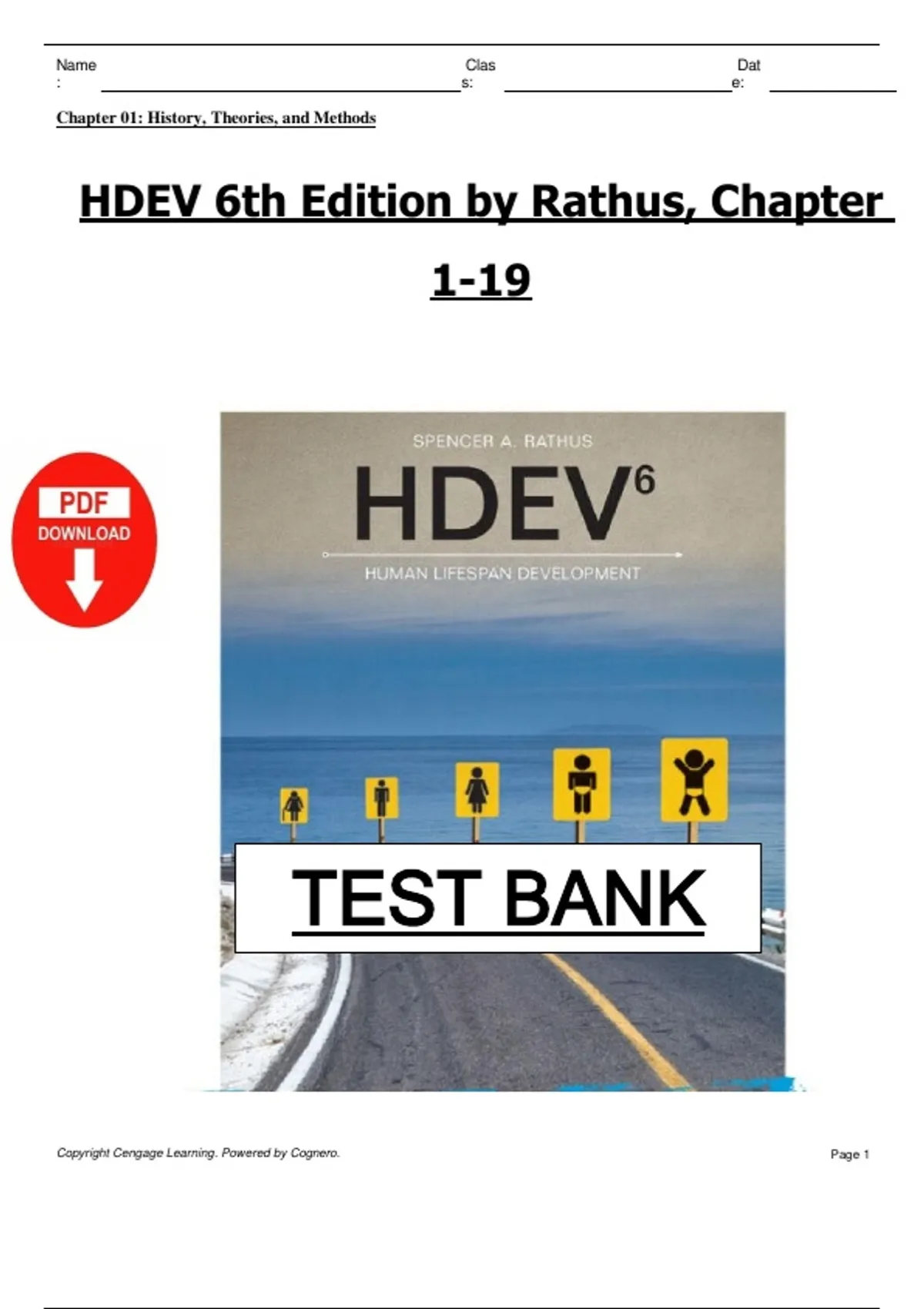 This document contains the complete test bank for HDEV (6th Edition) by Spencer A. Rathus, covering chapters 1 through 19. It provides exam-style questions with answers that cover major themes in human development across the lifespan. The material is designed to support effective studying and preparation for tests and exams.