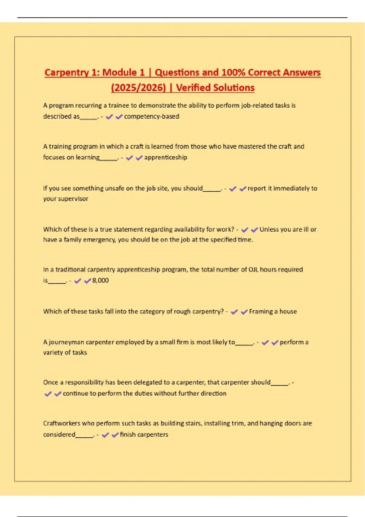 Carpentry 1: Module 1 | Questions and 100% Correct Answers (2025/2026) | Verified Solutions