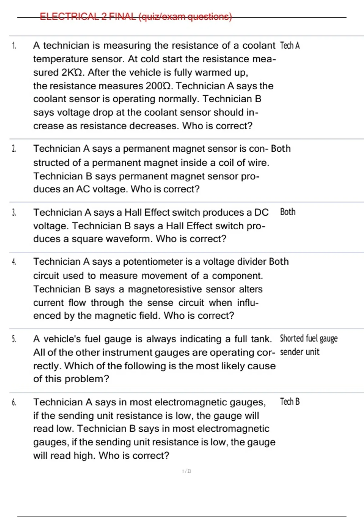 6. Technician A says in most electromagnetic gauges, Tech B