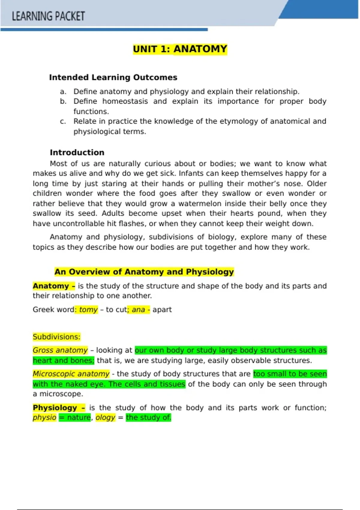 Anatomy – is the study of the structure and shape of the body and its parts and