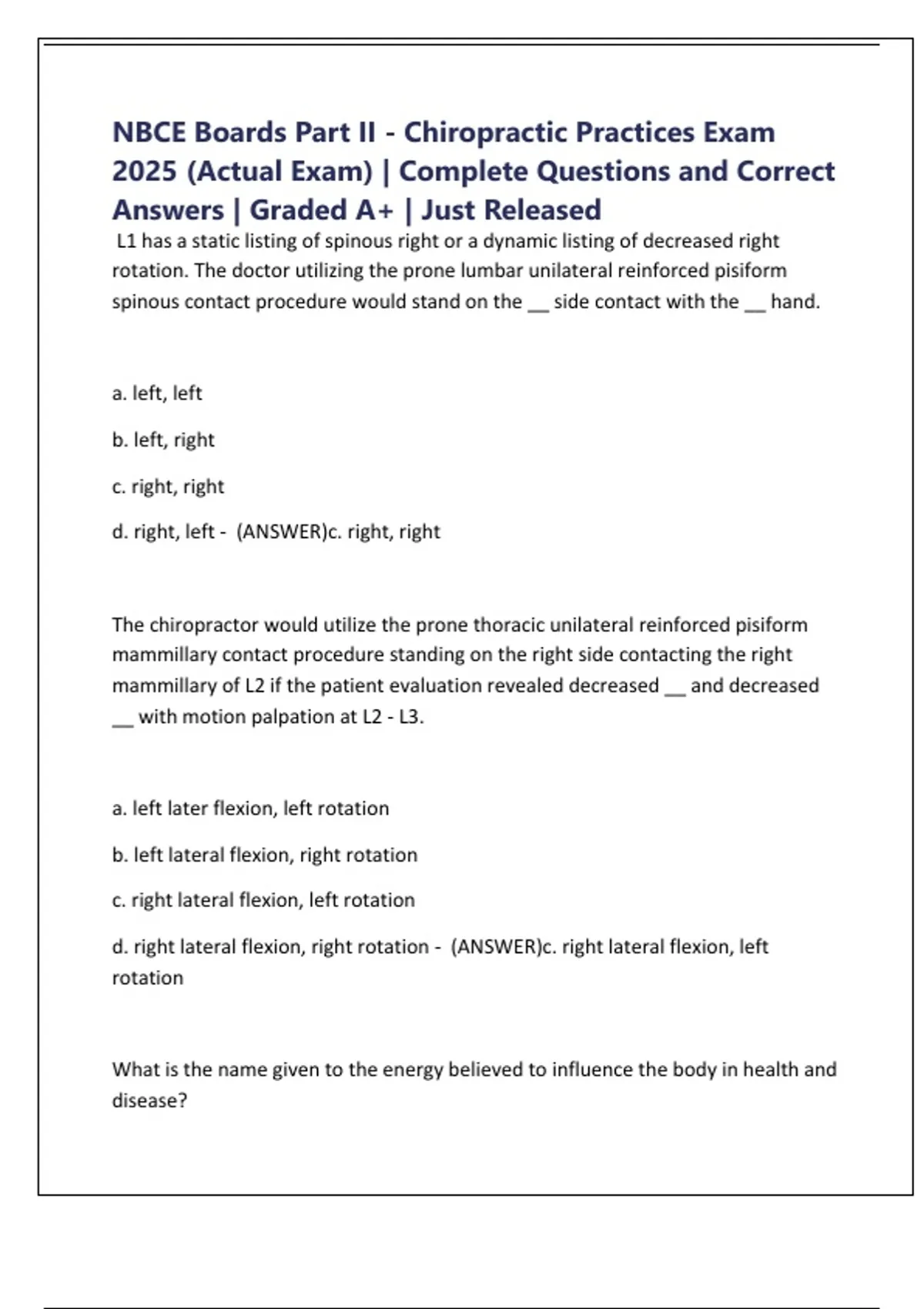 d. right lateral flexion, right rotation - (ANSWER)c. right lateral flexion, left