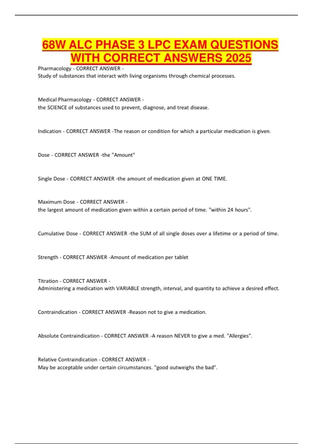 This document contains the official 68W ALC Phase 3 LPC Exam Questions with Correct Answers (2025 update). It is designed to help soldiers, medics, and students prepare for the Army 68W Advanced Leader Course. What’s included: Complete set of LPC exam questions with verified correct answers Updated for 2025 exam prep Covers leadership, patient care, combat medical tasks, and clinical scenarios Ideal for self-study, practice tests, and group study sessions 100% exam-focused — prepare with confidence and accuracy This 68W ALC Phase 3 LPC Exam Prep is the ultimate study resource for passing on the first attempt.