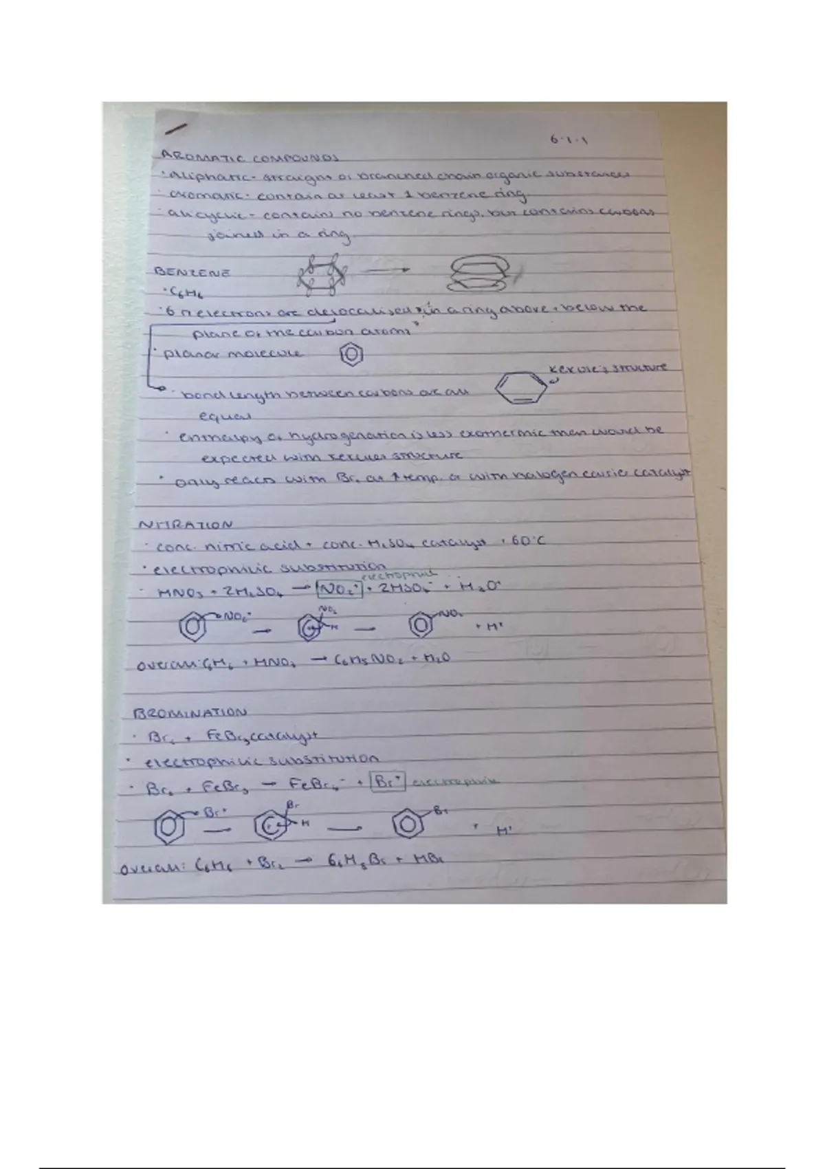Summary Notes from an A student including equations, diagrams, definitions, required practicals and examples of: - benzene - enthalpy of hydrogenation - nitration - bromination - chlorination - friedel-krafts alkylation and acylation - phenols - reactions of phenols - directing effects - benzene vs alkene reaction with Br2