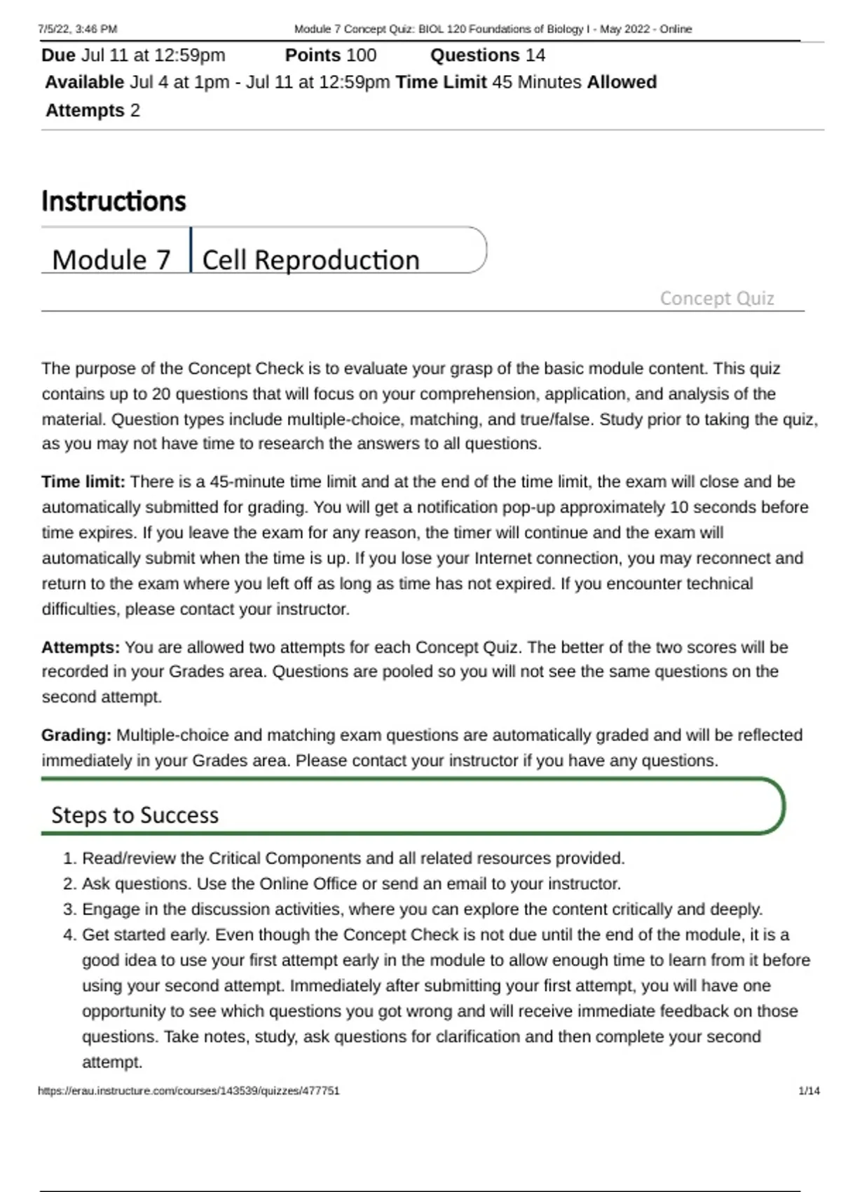 , 7/5/22, 3:46 PM Module 7 Concept Quiz: BIOL 120 Foundations of Biology I - May 2022 - Online