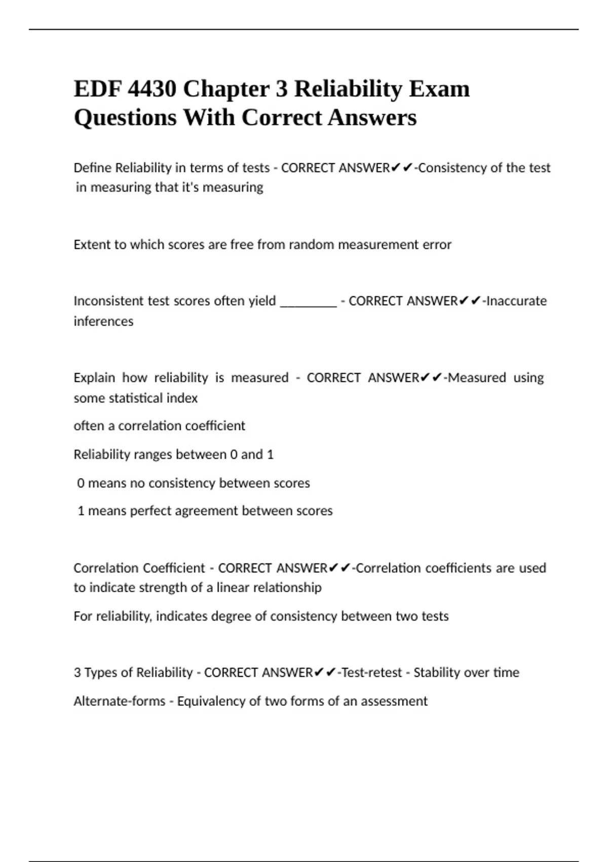 Define Reliability in terms of tests - CORRECT ANSWER✔✔-Consistency of the test