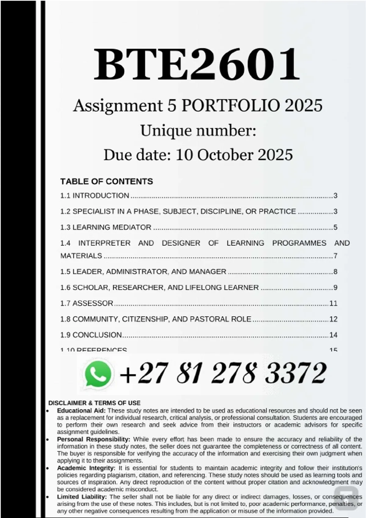 BTE2601 Assignment 5 PORTFOLIO (COMPLETE ANSWERS) 2025 - DUE 10 October 2025.. 1.1 Introduction (Approx. 200–300 words) - Briefly explain what the portfolio is about. - Mention the DHET policy (2015) as the basis of the seven roles. - State what the reader can expect (literature review, teacher interviews, personal reflections). - Mention the importance of understanding the multiple roles of a teacher. 1.2 Specialist in a Phase, Subject, Discipline, or Practice Theoretical Perspective (5 marks) - Define and explain the role using at least 1 (one) academic source (e.g., books, journal articles, policy documents). - Give real-life examples of how this role is applied in a school setting. - Use Harvard/APA in-text citations and include full references at the end of the assignment. In-Service Teacher Perspective (4 marks) - Summarise insights/ideas from your interviews with at least 1 one practising teacher about this role. - Share examples they gave of how they practise this role in their classrooms. Personal Reflection and Application (4 marks) - Reflect on what this role means to you as a future teacher. 1.3 Learning Mediator Theoretical Perspective (5 marks) - Define and explain the role using at least 1 (one) academic source (e.g., books, journal articles, policy documents). - Give real-life examples of how this role is applied in a school setting. - Use Harvard/APA in-text citations and include full references at the end of the assignment. In-Service Teacher Perspective (4 marks) - Summarise insights/ideas from your interviews with at least 1 one practising teacher about this role. - Share examples they gave of how they practise this role in their classrooms. Personal Reflection and Application (4 marks) - Reflect on what this role means to you as a future teacher. 1.4 Interpreter and Designer of Learning Programmes and Materials Theoretical Perspective (5 marks) - Define and explain the role using at least 1 (one) academic source (e.g., books, journal articles, policy documents). - Give real-life examples of how this role is applied in a school setting. - Use Harvard/APA in-text citations and include full references at the end of the assignment. In-Service Teacher Perspective (4 marks) - Summarise insights/ideas from your interviews with at least 1 one practising teacher about this role. - Share examples they gave of how they practise this role in their classrooms. Personal Reflection and Application (4 marks) - Reflect on what this role means to you as a future teacher. 1.5 Leader, Administrator, and Manager Theoretical Perspective (5 marks) - Define and explain the role using at least 1 (one) academic source (e.g., books, journal articles, policy documents). - Give real-life examples of how this role is applied in a school setting. - Use Harvard/APA in-text citations and include full references at the end of the assignment. In-Service Teacher Perspective (4 marks) - Summarise insights/ideas from your interviews with at least 1 one practising teacher about this role. - Share examples they gave of how they practise this role in their classrooms. Personal Reflection and Application (4 marks) - Reflect on what this role means to you as a future teacher. 1.6 Scholar, Researcher, and Lifelong Learner Theoretical Perspective (5 marks) - Define and explain the role using at least 1 (one) academic source (e.g., books, journal articles, policy documents). - Give real-life examples of how this role is applied in a school setting. - Use Harvard/ /APA in-text citations and include full references at the end of the assignment. In-Service Teacher Perspective (4 marks) - Summarise insights/ideas from your interviews with at least 1 one practising teacher about this role. - Share examples they gave of how they practise this role in their classrooms. Personal Reflection and Application (4 marks) - Reflect on what this role means to you as a future teacher. 1.7 Assessor Theoretical Perspective (5 marks) - Define and explain the role using at least 1 (one) academic source (e.g., books, journal articles, policy documents). - Give real-life examples of how this role is applied in a school setting. - Use Harvard /APA in-text citations and include full references at the end of the assignment. In-Service Teacher Perspective (4 marks) - Summarise insights/ideas from your interviews with at least 1 one practising teacher about this role. - Share examples they gave of how they practise this role in their classrooms. Personal Reflection and Application (4 marks) - Reflect on what this role means to you as a future teacher. 1.8 Community, Citizenship, and Pastoral Role Theoretical Perspective (5 marks) - Define and explain the role using at least 1 (one) academic source (e.g., books, journal articles, policy documents). - Give real-life examples of how this role is applied in a school setting. - Use Harvard/APA in-text citations and include full references at the end of the assignment. In-Service Teacher Perspective (4 marks) - Summarise insights/ideas from your interviews with at least 1 one practising teacher about this role. - Share examples they gave of how they practise this role in their classrooms. Personal Reflection and Application (4 marks) - Reflect on what this role means to you as a future teacher. 1.9 Conclusion - Summarise what you learned about the seven roles of educators. - Reflect briefly on how this knowledge has shaped your understanding of teaching. - State your commitment or readiness to apply these roles in your future classroom.