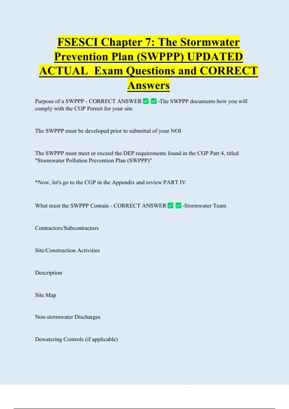 Purpose of a SWPPP - CORRECT ANSWER -The SWPPP documents how you will
