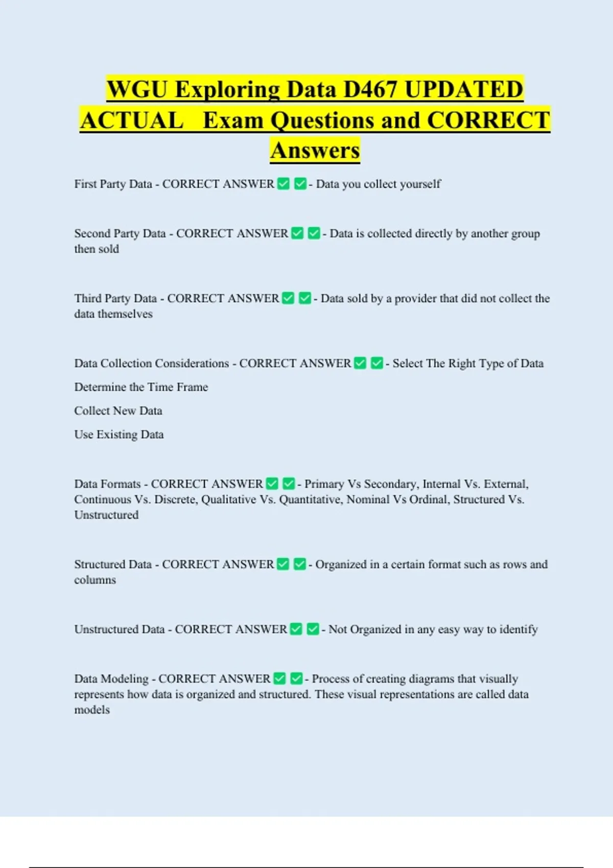 WGU Exploring Data D467 UPDATED ACTUAL Exam Questions and CORRECT Answers First Party Data - CORRECT ANSWER Second Party Data - CORRECT ANSWER then sold Third Party Data - CORRECT ANSWER data themselves - Data you collect yourself - Data is collected directly by another group - Data sold by a provider that did not collect