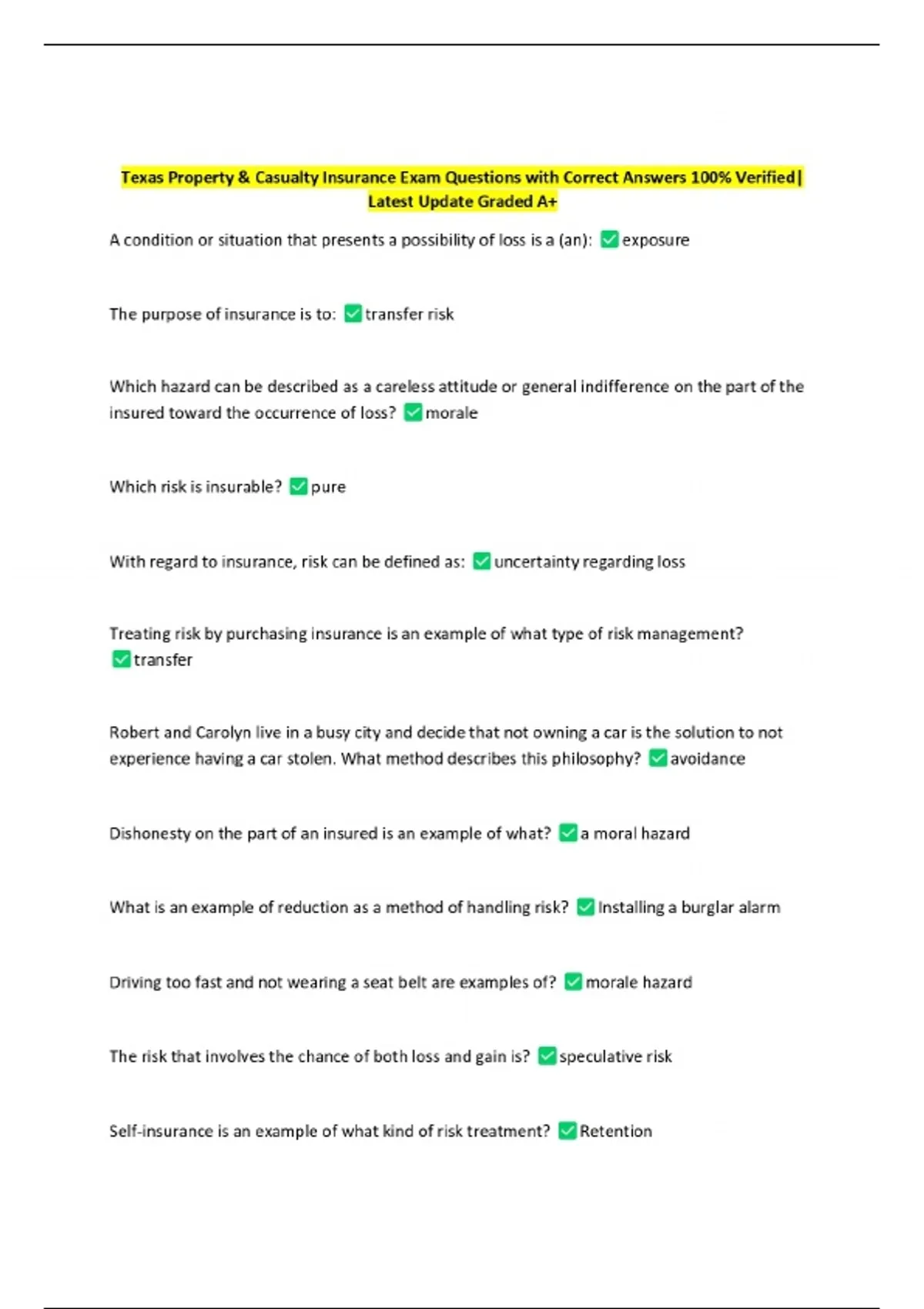 Texas Property & Casualty Insurance Exam Questions with Correct Answers 100% Verified| Latest Update Graded A+