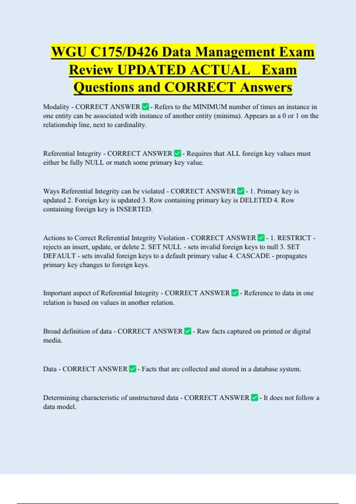 WGU C175/D426 Data Management Exam Review UPDATED ACTUAL Exam Questions and CORRECT Answers Modality - CORRECT ANSWER - Refers to the MINIMUM number of times an instance in one entity can be associated with instance of another entity (minima). Appears as a 0 or 1 on the relationship line, next to cardinality. Referential Integrity - CORRECT ANSWER - Requires that ALL foreign key values must either be fully NULL or match some primary key value.