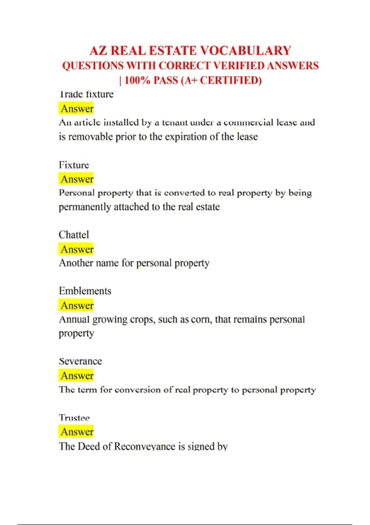 AZ REAL ESTATE VOCABULARY QUESTIONS WITH CORRECT VERIFIED ANSWERS | 100% PASS (A+ CERTIFIED) Trade fixture Answer An article installed by a tenant under a commercial lease and is removable prior to the expiration of the lease Fixture Answer Personal property that is converted to real property by being permanently attached to the real estate Chattel Answer Another name for personal property Emblements Answer Annual growing crops, such as corn, that remains personal property Severance Answer The term for conversion of real property to personal property Trustee Answer The Deed of Reconveyance is signed by Cooperative Answer Multi-unit residential building owned by a corporation and operated on behalf of the stockholder/tenants who hold proprietary leases Condominium Answer Multi-unit development in which owners own their units separately and share ownership of common facilities Condominium/cooperative Answer A condominium owner actually owns real estate. This ownership is usually the airspace and an interest as a tenant in common of the land. A cooperative owner owns shares in the corporation that owns a building. The shareholder also gets a propriety lease, which enables the shareholder to occupy a unit. Townhomes Answer Non-profit organization, comprised of unit owners as members, owns the common areas Equity Answer Value an owner has in property over and above any indebtedness Special agency Answer Agent who has agreed to represent a principal in one business transaction has created which type of agency? Puffing Answer Non-fraudulent exaggeration of a property's benefits or features Principal Answer Individual who hires and delegates to the agent the responsibilities of representing his or her interests Client Answer Is another name for a principal. Implied agency Answer Establishment of an agency relationship as a result of the actions of the parties which indicates mutual consent Dual agency Answer Agent representing two parties simultaneously creates which type of agency? Stigmatized property Answer Discovery that a murder, suicide or death occurred on a property. Properties where events that make the property less desirable to some people have taken place. Latent defect Answer A house with a structural defect. problems that the buyer customers or buyer agents wouldn't find out about through a normal inspection. Material defects Answer Things that need to be revealed usually are called Conversion Answer When a broker misappropriates trust funds Procuring cause Answer Broker who starts an uninterrupted chain of events that results in the sale of a property