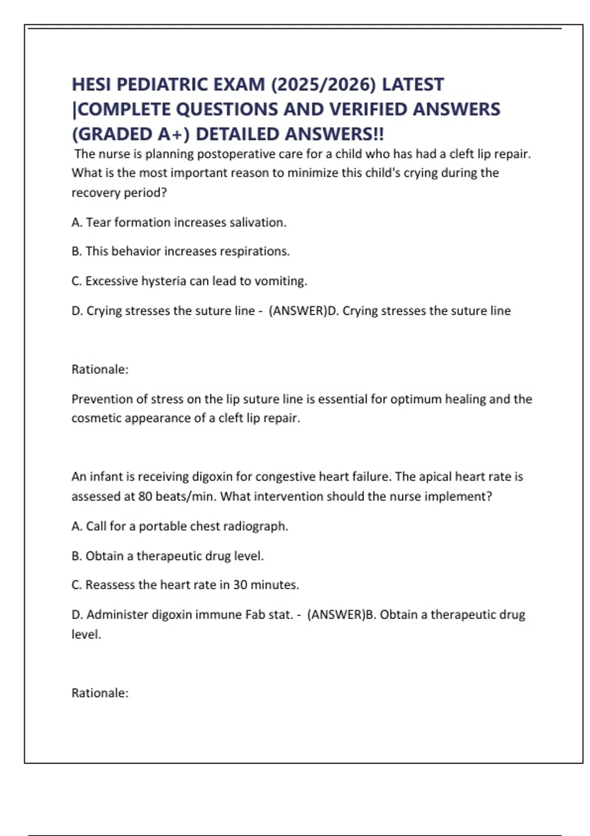 HESI PEDIATRIC EXAM (2025/2026) LATEST |COMPLETE QUESTIONS AND VERIFIED ANSWERS (GRADED A+) DETAILED ANSWERS!!