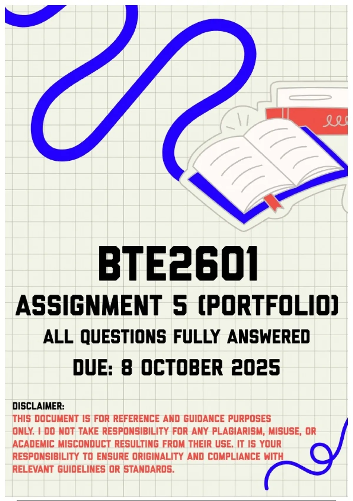 BTE2601 Assignment 5 (Portfolio) Memo | Due 8 October 2025. All questions fully answered. EXPLORING THE SEVEN ROLES OF EDUCATORS: A PORTFOLIO OF THEORY, PRACTICE, AND PERSONAL REFLECTION TABLE OF CONTENTS 1.1 Introduction…………………..……………………………………………00 1.2 Specialist in a Phase, Subject, Discipline, or Practice………………………00 1.3 Learning Mediator………………………………………………………..…00 1.4 Interpreter and Designer of Learning Programmes and Materials…………00 1.5 Leader, Administrator, and Manager………………………………….……00 1.6 Scholar, Researcher, and Lifelong Learner…………………………………00 1.7 Assessor…………………………………………………………………….00 1.8 Community, Citizenship, and Pastoral Role………………………………..00