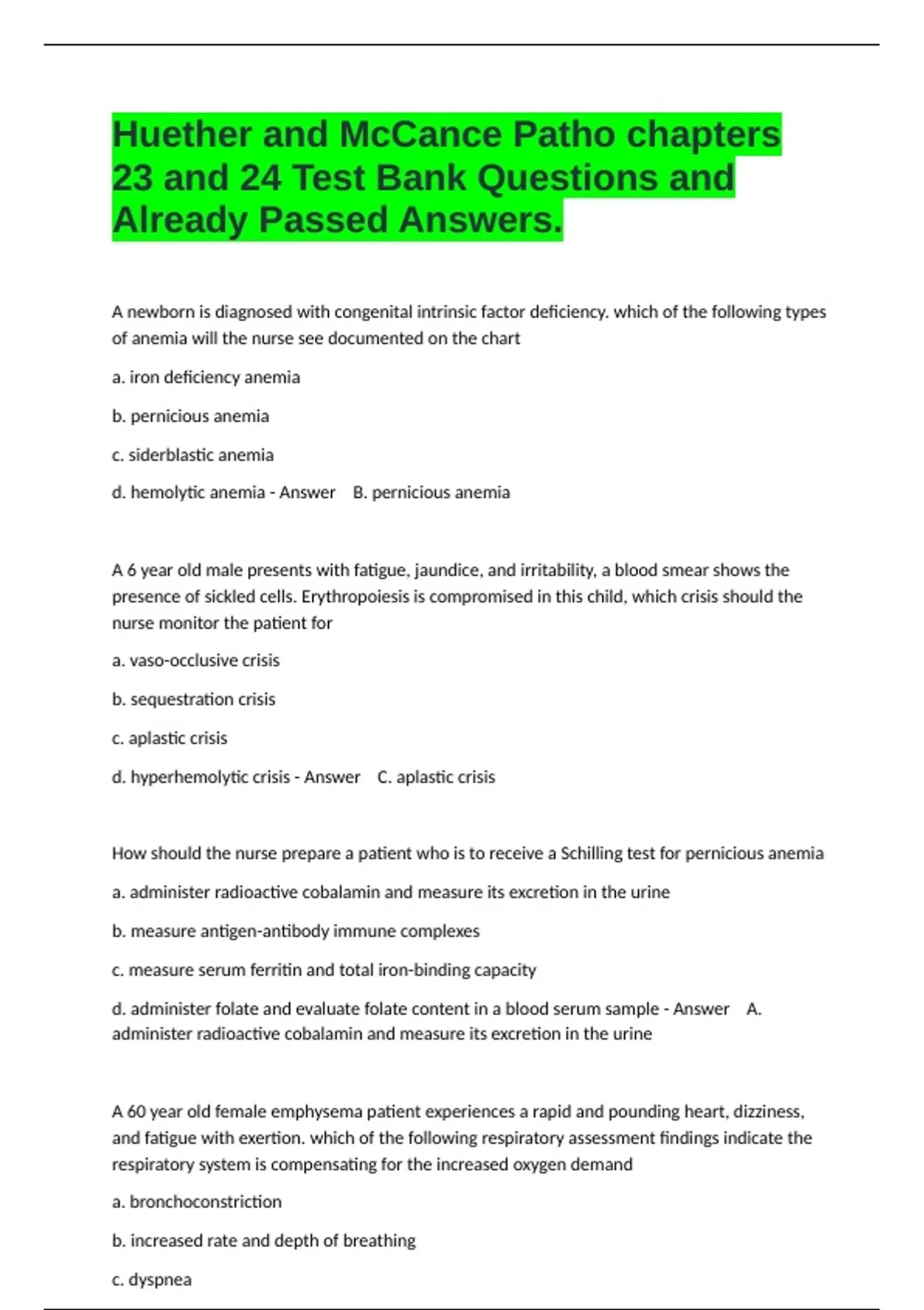 A newborn is diagnosed with congenital intrinsic factor deficiency. which of the following types of anemia will the nurse see documented on the chart a. iron deficiency anemia b. pernicious anemia c. siderblastic anemia d. hemolytic anemia - Answer B. pernicious anemia A 6 year old male presents with fatigue, jaundice, and irritability, a blood smear shows the presence of sickled cells. Erythropoiesis is compromised in this child, which crisis should the nurse monitor the patient for a. vaso-occlusive crisis b. sequestration crisis c. aplastic crisis d. hyperhemolytic crisis - Answer C. aplastic crisis How should the nurse prepare a patient who is to receive a Schilling test for pernicious anemia a. administer radioactive cobalamin and measure its excretion in the urine b. measure antigen-antibody immune complexes c. measure serum ferritin and total iron-binding capacity d. administer folate and evaluate folate content in a blood serum sample - Answer A. administer radioactive cobalamin and measure its excretion in the urine A 60 year old female emphysema patient experiences a rapid and pounding heart, dizziness, and fatigue with exertion. which of the following respiratory assessment findings indicate the respiratory system is compensating for the increased oxygen demand a. bronchoconstriction b. increased rate and depth of breathing c. dyspnea d. activation of the renin-angiotensin response - Answer B. increased rate and depth of breathing