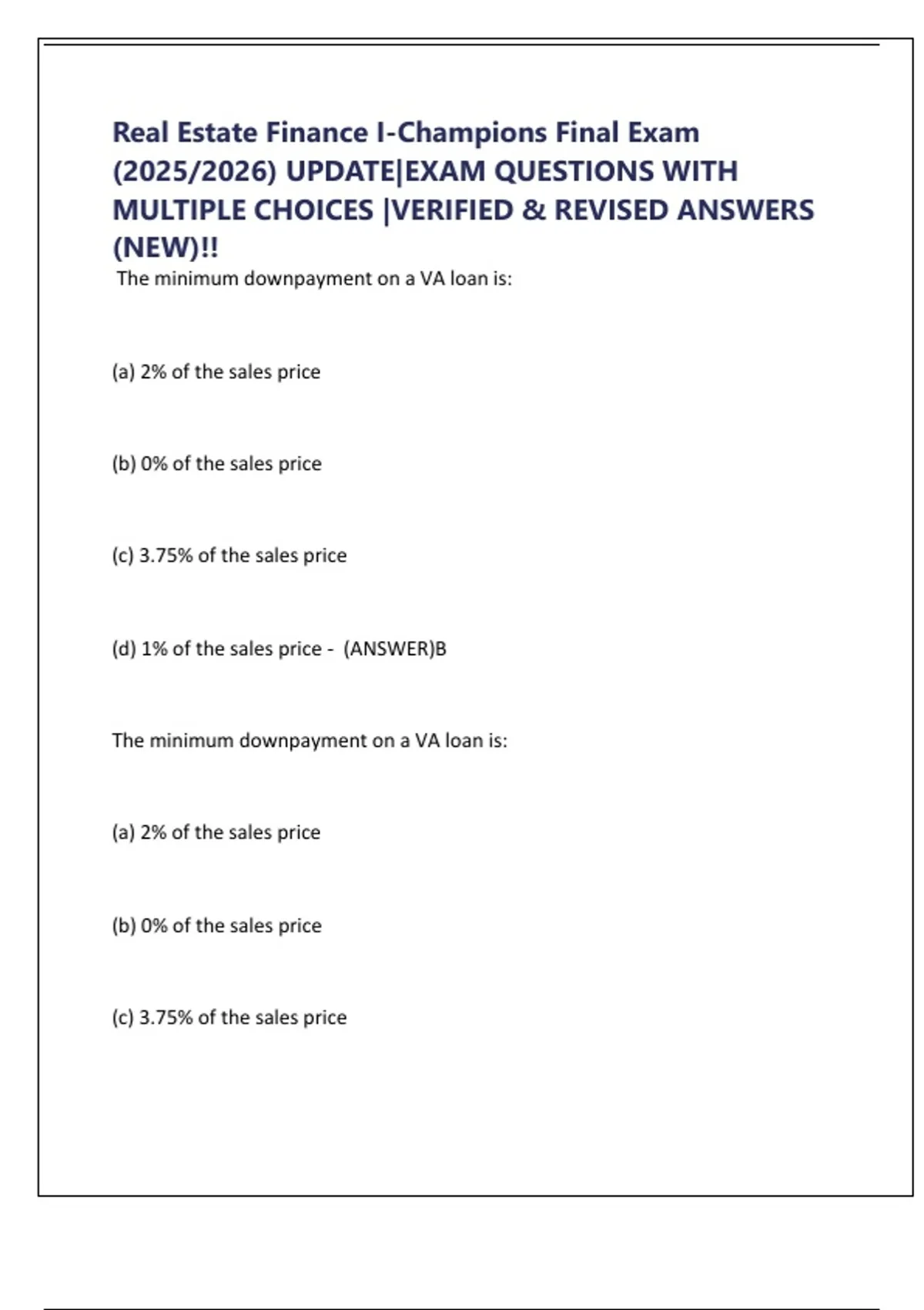 Real Estate Finance I-Champions Final Exam