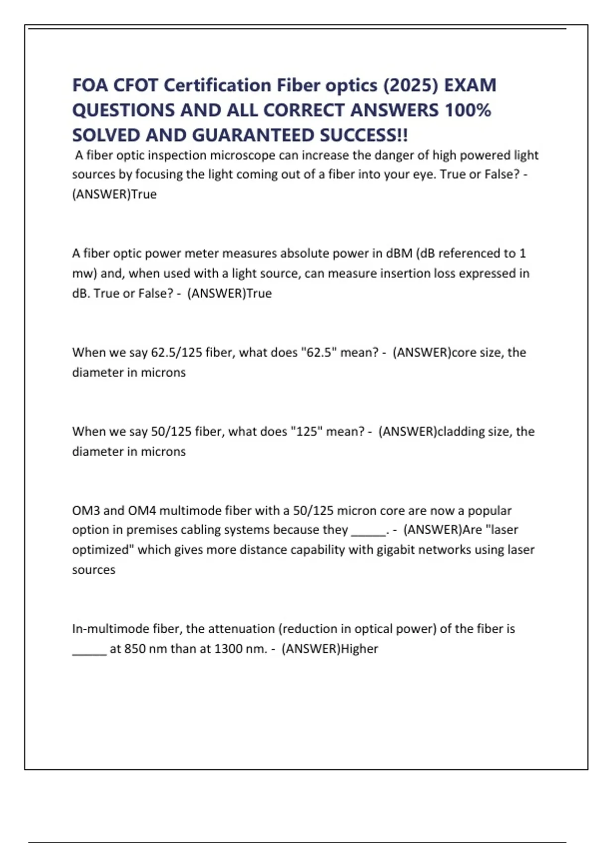 FOA CFOT Certification Fiber optics (2025) EXAM