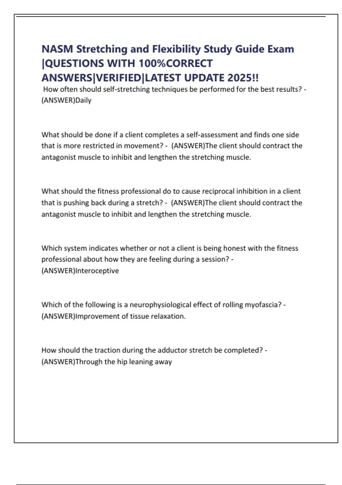 NASM Stretching and Flexibility Study Guide Exam |QUESTIONS WITH 100%CORRECT ANSWERS|VERIFIED|LATEST UPDATE 2025!!