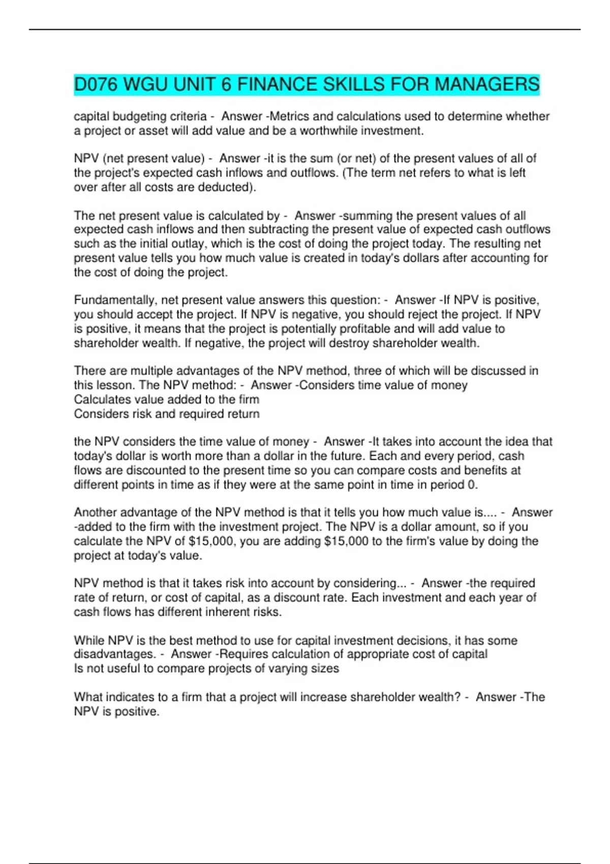 D076 WGU UNIT 6 FINANCE SKILLS FOR MANAGERS