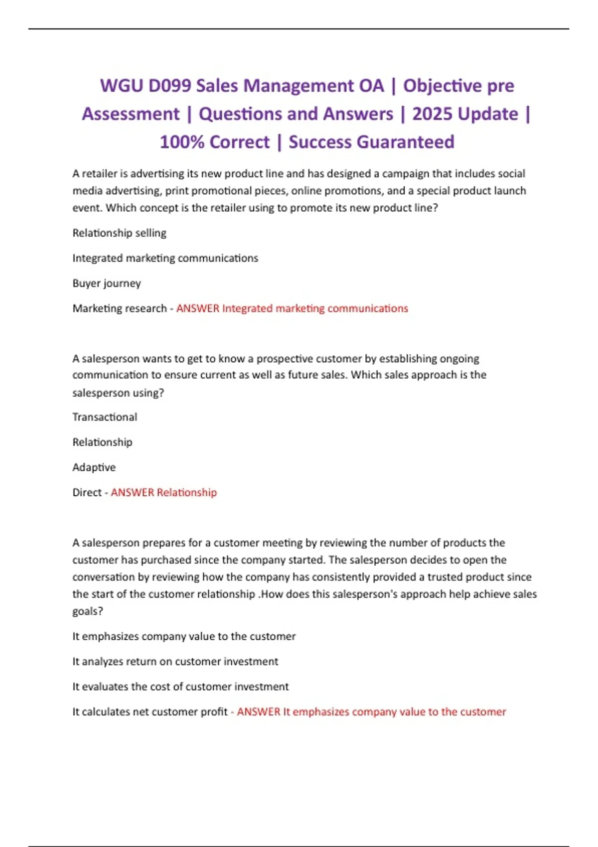 WGU D099 Sales Management OA | Objective pre Assessment | Questions and Answers | 2025 Update | 100% Correct | Success Guaranteed