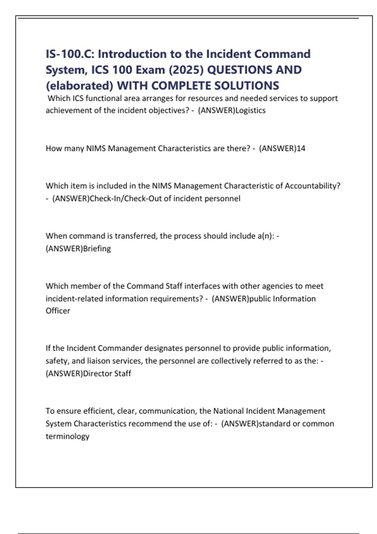 IS-100.C: Introduction to the Incident Command System, ICS 100 Exam (2025) QUESTIONS AND (elaborated) WITH COMPLETE SOLUTIONS