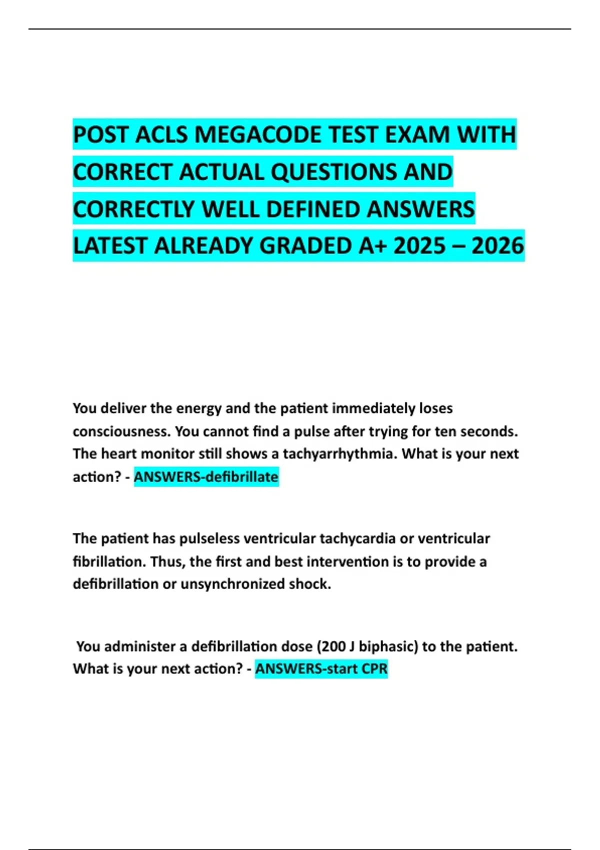 POST ACLS MEGACODE TEST EXAM WITH CORRECT ACTUAL QUESTIONS AND CORRECTLY WELL DEFINED ANSWERS LATEST ALREADY GRADED A+ 2025 – 2026