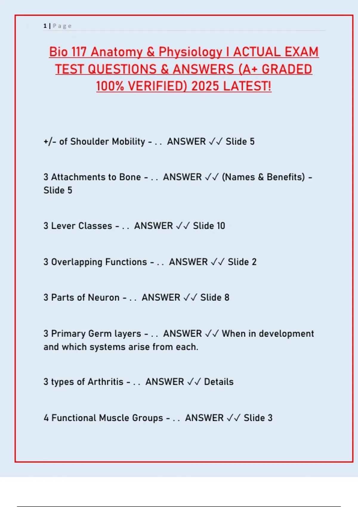 Prepare for your Bio 117 Anatomy & Physiology exam with this comprehensive guide featuring actual test questions and verified answers for 2025. Topics include shoulder mobility, bone attachments, neuron structure, germ layers, arthritis types, muscle groups, and more. Perfect for quick review and guaranteed A+ results!