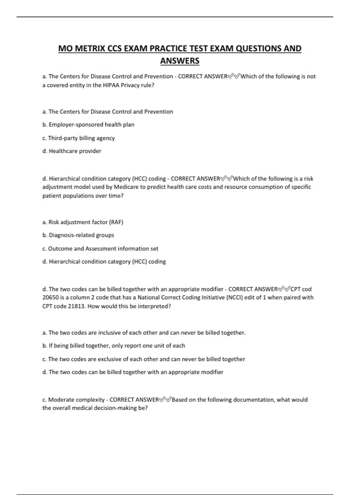 MO METRIX CCS EXAM PRACTICE TEST EXAM QUESTIONS AND ANSWERS a. The Centers for Disease Control and Prevention - CORRECT ANSWERWhich of the following is not a covered entity in the HIPAA Privacy rule? a. The Centers for Disease Control and Prevention b. Employer-sponsored health plan c. Third-party billing agency d. Healthcare provider
