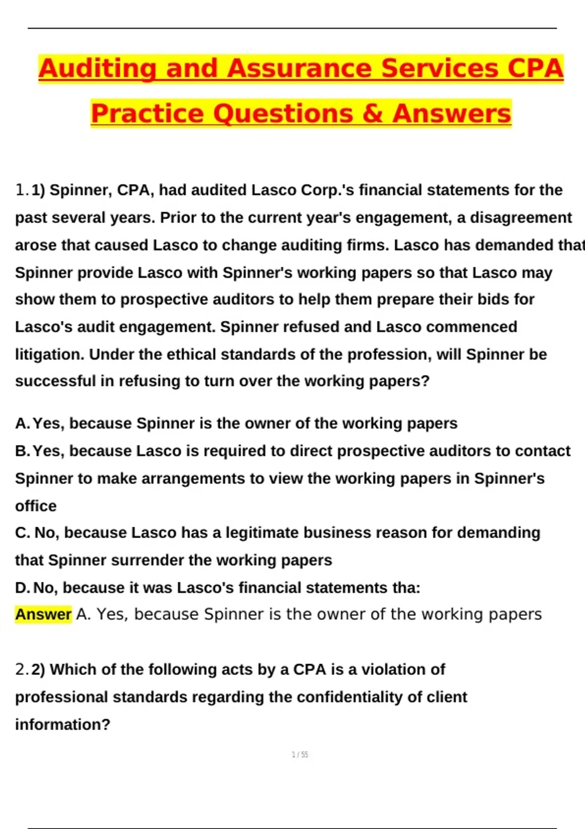 1.1) Spinner, CPA, had audited Lasco Corp.'s financial statements for the