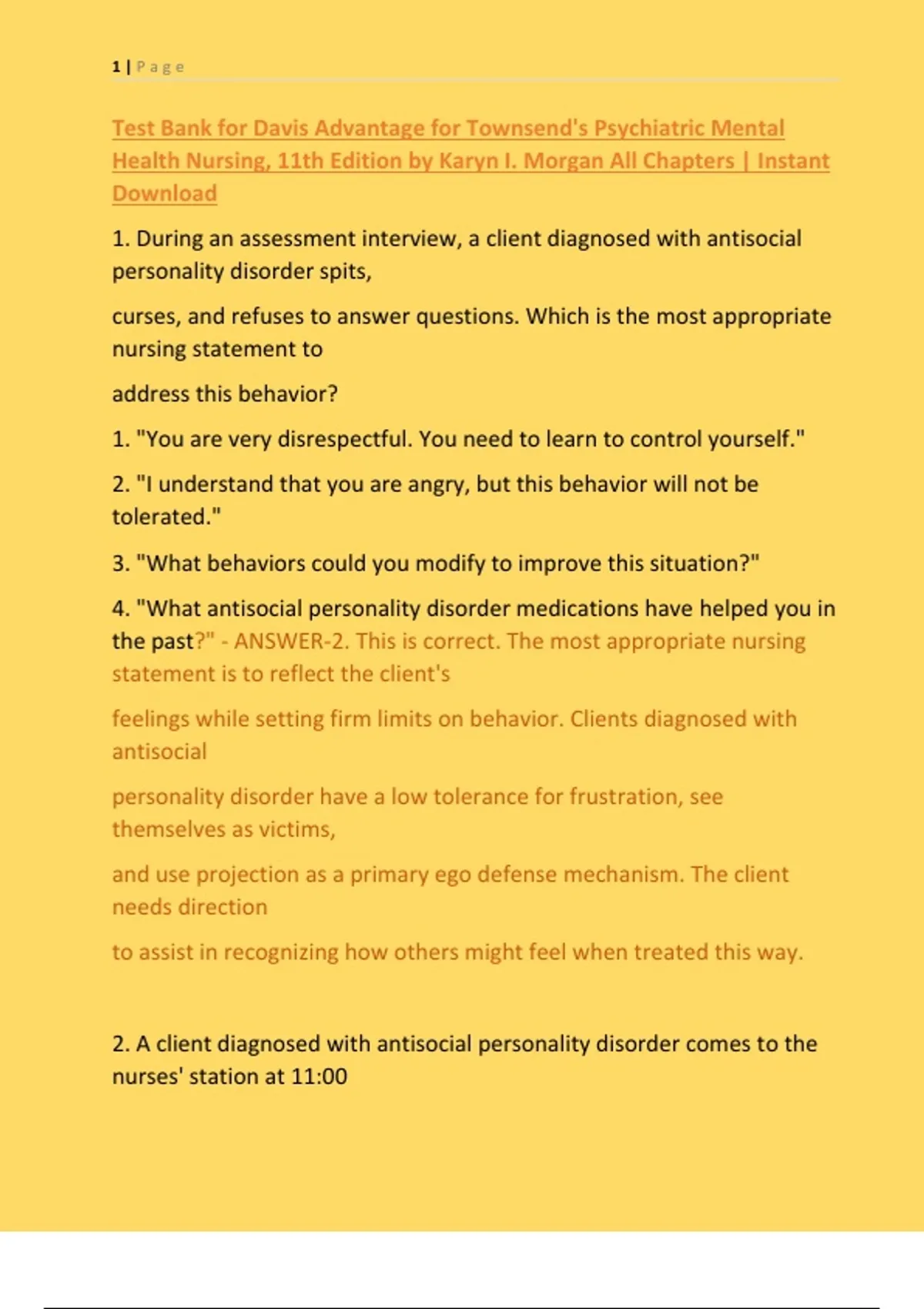 Test Bank for Davis Advantage for Townsend's Psychiatric Mental