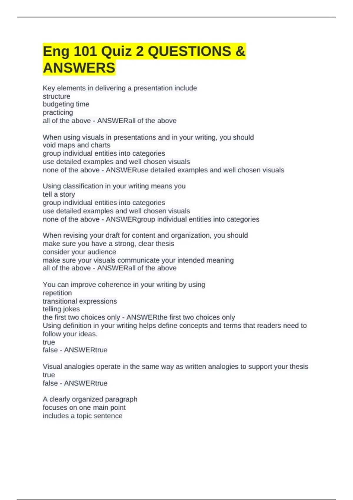 Eng 101 Quiz 2 QUESTIONS & ANSWERS