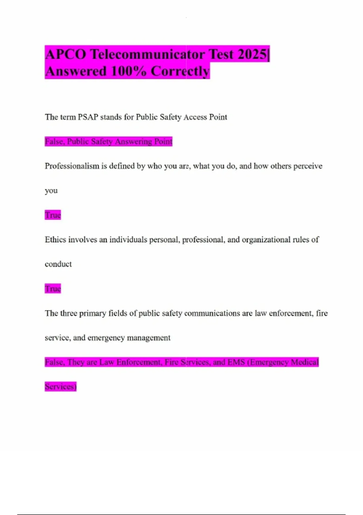 APCO Telecommunicator Test 2025| Answered 100% Correctly The term PSAP stands for Public Safety Access Point False, Public Safety Answering Point Professionalism is defined by who you are, what you do, and how others perceive you True Ethics involves an individuals personal, professional, and organizational rules of conduct True The three primary fields of public safety communications are law enforcement, fire service, and emergency management False, They are Law Enforcement, Fire Services, and EMS (Emergency Medical Services) The term vital services defines the primary functions or tasks of public safety communications systems True Telephone books, maps, and cross reference directories are examples of PSAP informational resources True A policy is a guide to action and a procedure is a guide to thinking False, A policy is a guide to thinking and a procedure is a guide to action All non verbal communication requires face to face communication False A question that can't be answered yes or no is an open ended question True Restating a speakers main points in your own words is applying the active listening technique False Repeating in a short declarative statement the emotions or feelings the speaker is communicating is applying the active listening technique of paraphrasing