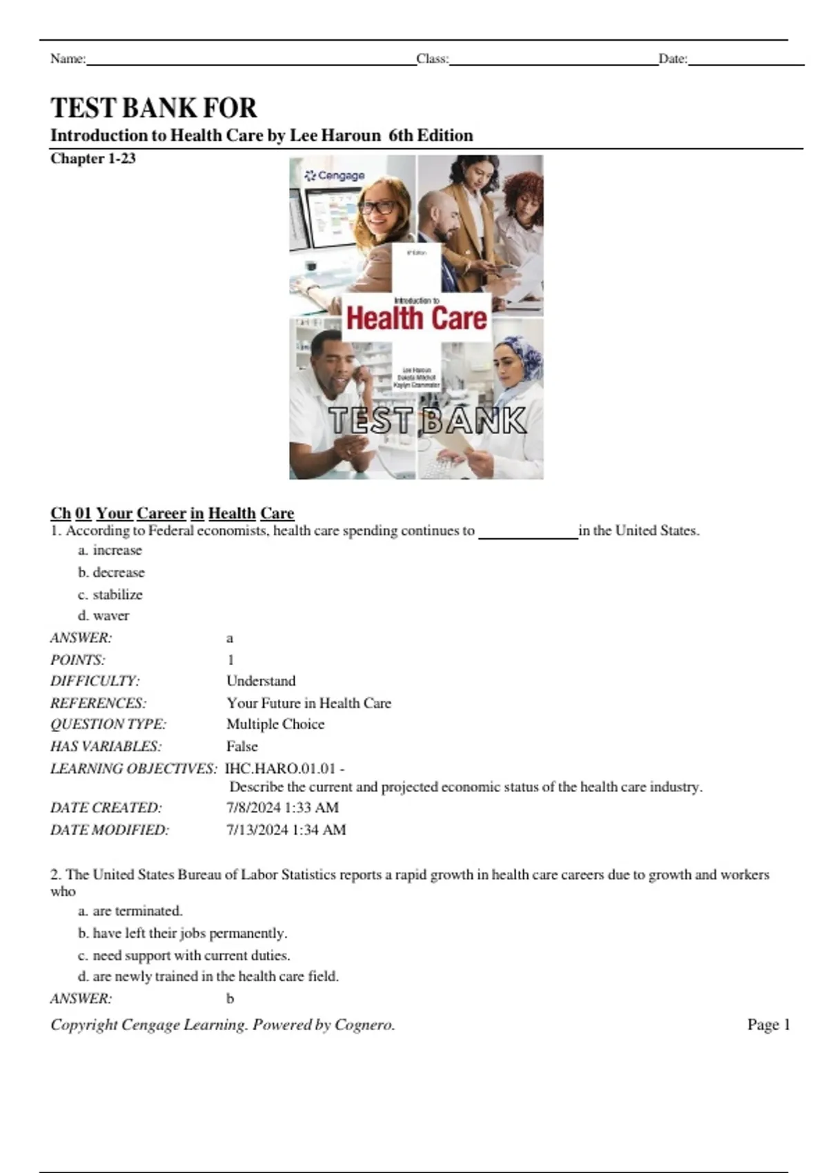 Test Bank for Introduction to Health Care (6th Edition by Lee Haroun