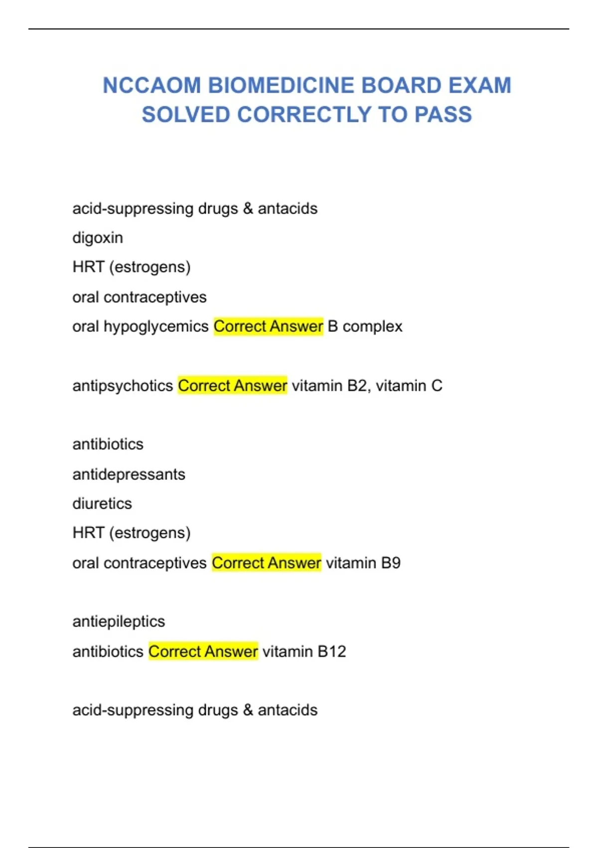 NCCAOM BIOMEDICINE BOARD EXAM SOLVED CORRECTLY TO PASS
