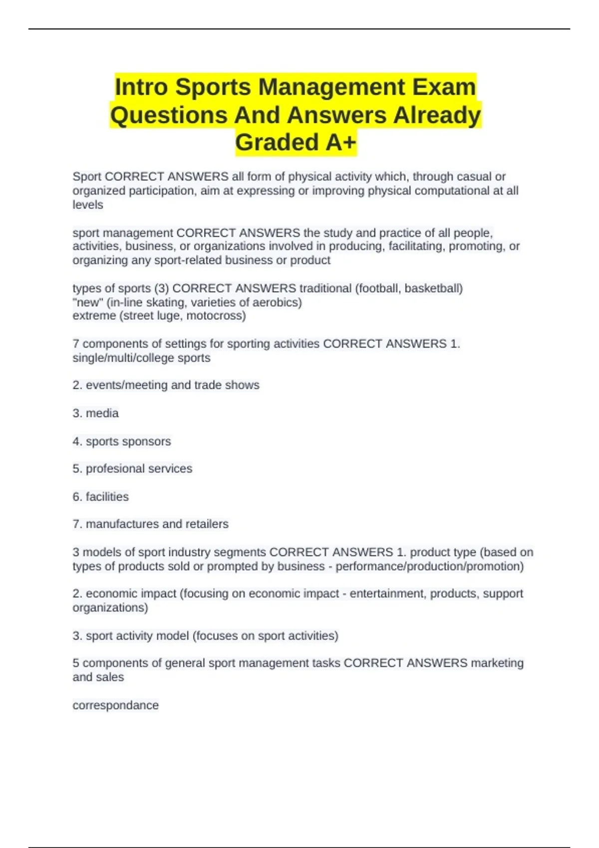 Intro Sports Management Exam Questions And Answers Already Graded A+