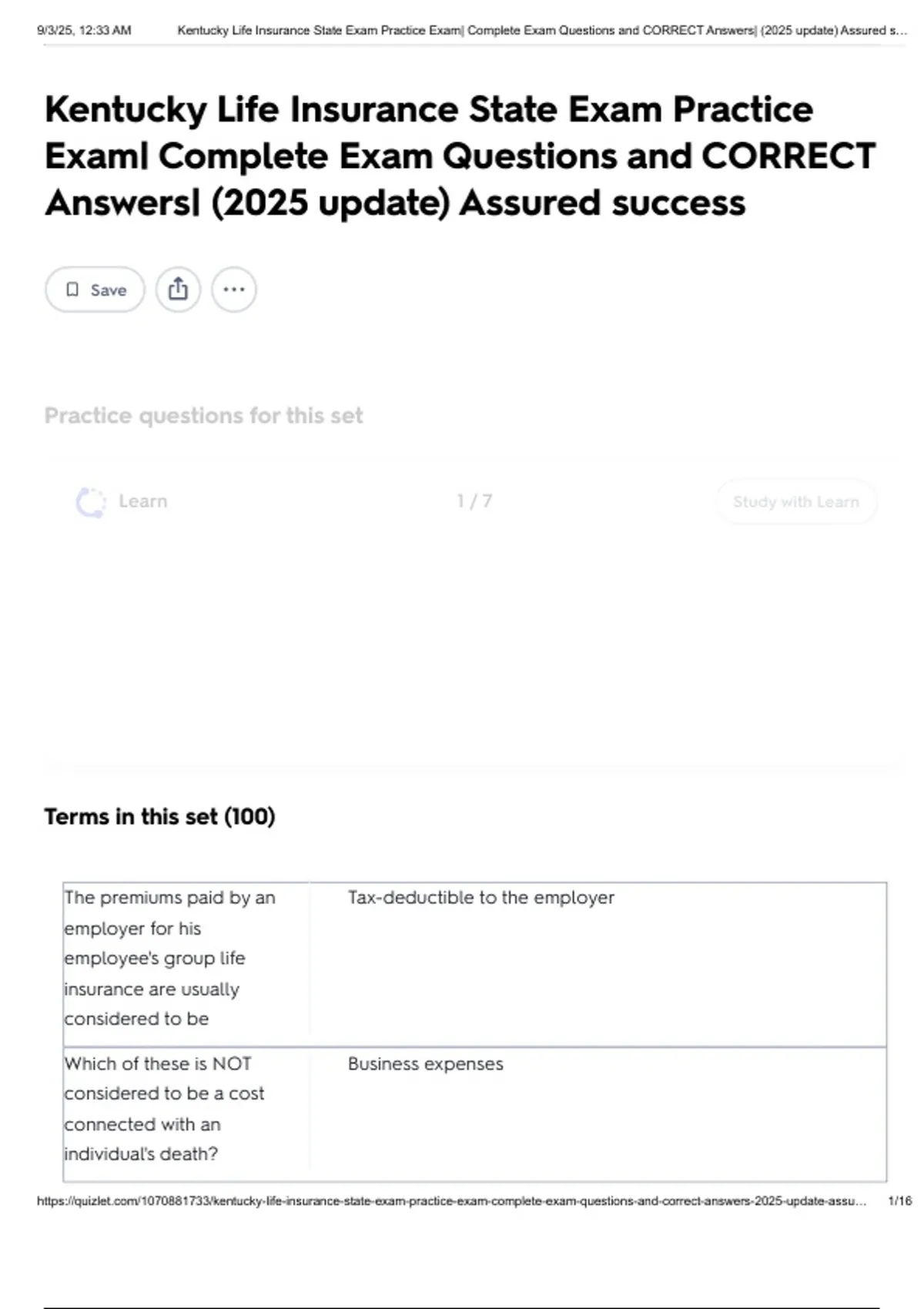 , 9/3/25, 12:33 AM Kentucky Life Insurance State Exam Practice Exam| Complete Exam Questions and CORRECT Answers| (2025 update) Assured s…