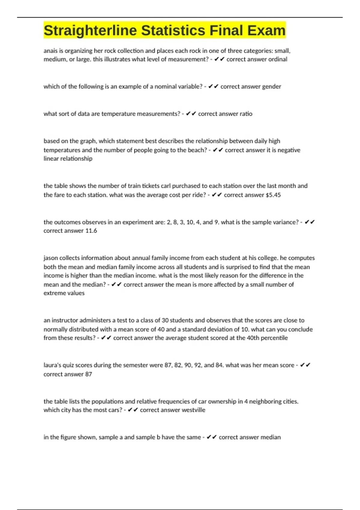 , Straighterline Statistics Final Exam