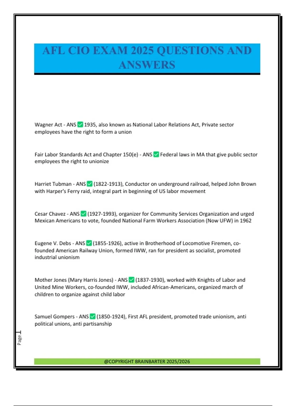 Wagner Act - ANS 1935, also known as National Labor Relations Act, Private sector employees have the right to form a union Fair Labor Standards Act and Chapter 150(e) - ANS Federal laws in MA that give public sector employees the right to unionize Harriet Tubman - ANS (), Conductor on underground railroad, helped John Brown with Harper's Ferry raid, integral part in beginning of US labor movement Cesar Chavez - ANS (), organizer for Community Services Organization and urged Mexican Americans to vote, founded National Farm Workers Association (Now UFW) in 1962 Eugene V. Debs - ANS (), active in Brotherhood of Locomotive Firemen, co- founded American Railway Union, formed IWW, ran for president as socialist, promoted industrial unionism Mother Jones (Mary Harris Jones) - ANS (), worked with Knights of Labor and United Mine Workers, co-founded IWW, included African-Americans, organized march of children to organize against child labor Samuel Gompers - ANS (), First AFL president, promoted trade unionism, anti political unions, anti partisanship @COPYRIGHT BRAINBARTER 2025/2026 Page2 Ai-Jen Poo - ANS (1974-Present), Executive Director and co-founder of National Domestic Workers Alliance, fought to pass Domestic Workers' Bill of Rights, aims to promote better conditions for elderly and elderly care workers with Caring Across Generations. A. Phillip Randolph - ANS (), organizes Brotherhood of Sleeping Car Porters-the first predominantly African-American Union, Organized and got Roosevelt to ban discrimination in the labor market and monitor employment, organized 1963 March on Washington Rose Schneiderman - ANS (), leader of Women's Trade Union League of NY, involved in uprising of 20,000 protesting against treatment of immigrants in garment industry, served in Roosevelt admin. on Labor Advisory Board John McBride - ANS (AFL 1894 to 1895) William Green - ANS (AFL ), 3rd President AFL, legislated wage and benefit protections for industrial unionism, moved AFL to be more politically John L. Lewis - ANS (AFL 938-1940), president of United Mine Workers of America 1920-60, founded CIO (congress of industrial organizations, Philip Murray - ANS (CIO ), stabilized industrial labor movement started by Lewis, cemented alliance between unions and liberal democrats, created better relationship with AFL Walter Reuther - ANS (CIO ), president United Automobile Workers, negotiated AFL and CIO merger in 1955, George Meany - ANS (AFL-CIO ), (AFL 1952-55), First AFL-CIO pres. 4th AFL president, joined United Association of Plumbers and Pipe fitters at 16, pushed for 1964 Civil Rights Act, expanded politic