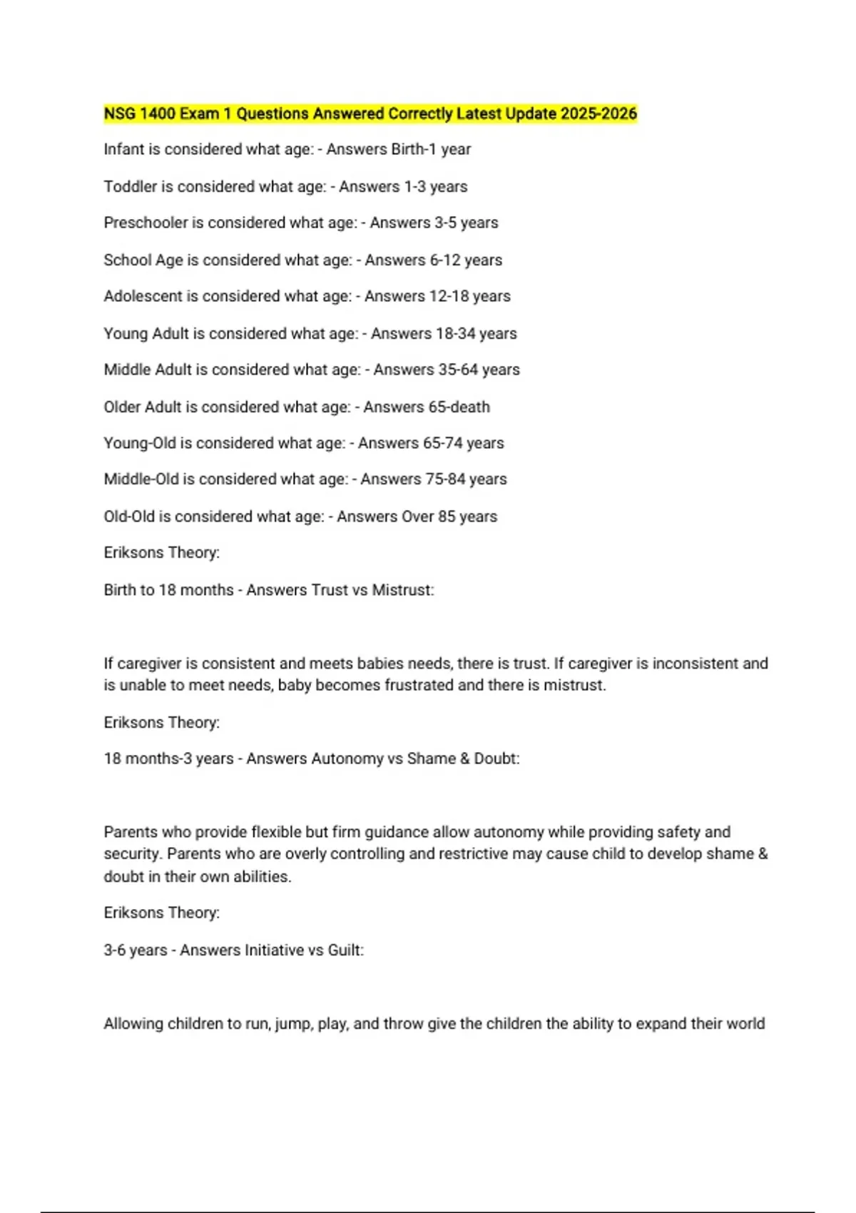 NSG 1400 Exam 1 Questions Answered Correctly Latest Update Infant is considered what age: - Answers Birth-1 year Toddler is considered what age: - Answers 1-3 years Preschooler is considered what age: - Answers 3-5 years School Age is considered what age: - Answers 6-12 years Adolescent is considered what age: - Answers 12-18 years Young Adult is considered what age: - Answers 18-34 years Middle Adult is considered what age: - Answers 35-64 years Older Adult is considered what age: - Answers 65-death Young-Old is considered what age: - Answers 65-74 years Middle-Old is considered what age: - Answers 75-84 years Old-Old is considered what age: - Answers Over 85 years Eriksons Theory: Birth to 18 months - Answers Trust vs Mistrust: If caregiver is consistent and meets babies needs, there is trust. If caregiver is inconsistent and is unable to meet needs, baby becomes frustrated and there is mistrust. Eriksons Theory: 18 months-3 years - Answers Autonomy vs Shame & Doubt: Parents who provide flexible but firm guidance allow autonomy while providing safety and security. Parents who are overly controlling and restrictive may cause child to develop shame & doubt in their own abilities. Eriksons Theory: 3-6 years - Answers Initiative vs Guilt: Allowing children to run, jump, play, and throw give the children the ability to expand their world and explore who they may become. Parents who limit this may give their children a sense of guilt. Eriksons Theory: 6-12 years - Answers Industry vs Inferiority: School plays an important role. Kids are starting to learn and take pride in accomplishments. Failure can lead to inferiority. Teachers and parents should help children understand what constitutes success & failure. Eriksons Theory: 12-18 years - Answers Identity vs Role Confusion: