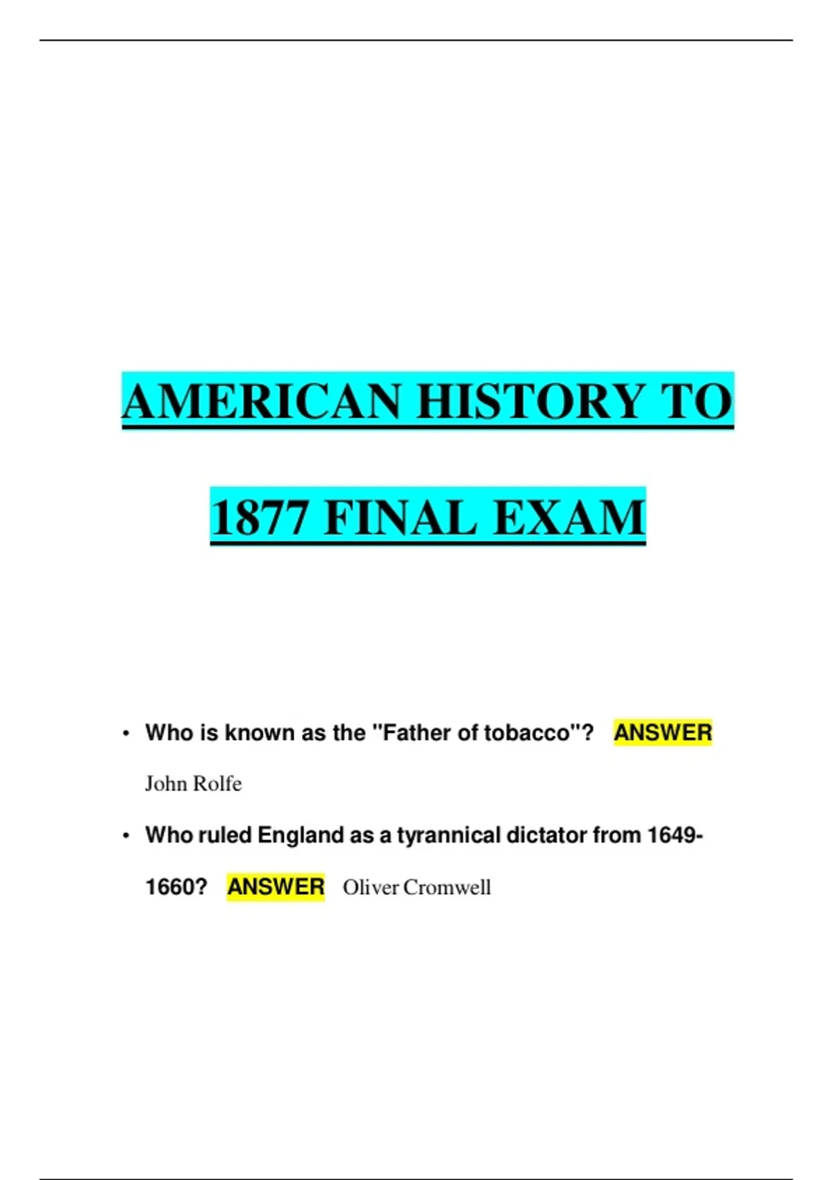 American History to 1877 Final Exam all Questions with 100% Correct Answers.
