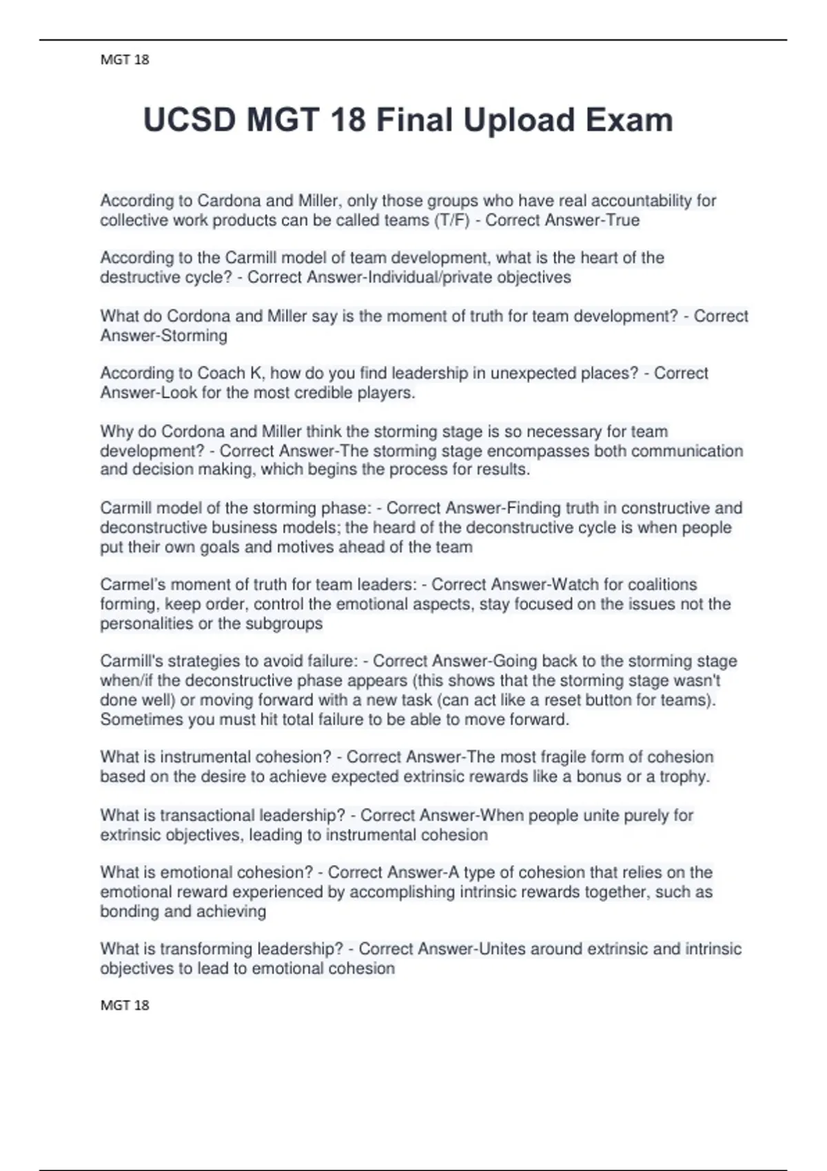 UCSD MGT 18 Final Upload Exam According to Cardona and Miller, only those groups who have real accountability for collective work products can be called teams (T/F) - Correct Answer-True According to the Carmill model of team development, what is the heart of the destructive cycle? - Correct Answer-Individual/private objectives What do Cordona and Miller say is the moment of truth for team development? - Correct Answer-Storming According to Coach K, how do you find leadership in unexpected places? - Correct Answer-Look for the most credible players. Why do Cordona and Miller think the storming stage is so necessary for team development? - Correct Answer-The storming stage encompasses both communication and decision making, which begins the process for results. Carmill model of the storming phase: - Correct Answer-Finding truth in constructive and deconstructive business models; the heard of the deconstructive cycle is when people put their own goals and motives ahead of the team Carmel’s moment of truth for team leaders: - Correct Answer-Watch for coalitions forming, keep order, control the emotional aspects, stay focused on the issues not the personalities or the subgroups Carmill's strategies to avoid failure: - Correct Answer-Going back to the storming stage when/if the deconstructive phase appears (this shows that the storming stage wasn't done well) or moving forward with a new task (can act like a reset button for teams). Sometimes you must hit total failure to be able to move forward. What is instrumental cohesion? - Correct Answer-The most fragile form of cohesion based on the desire to achieve expected extrinsic rewards like a bonus or a trophy. What is transactional leadership? - Correct Answer-When people unite purely for extrinsic objectives, leading to instrumental cohesion What is emotional cohesion? - Correct Answer-A type of cohesion that relies on the emotional reward experienced by accomplishing intrinsic rewards together, such as bonding and achieving What is transforming leadership? - Correct Answer-Unites around extrinsic and intrinsic objectives to lead to emotional cohesion MGT 18 MGT 18 What is structural cohesion? - Correct Answer-The most powerful type of cohesion, relies on the deep awareness of one's ability to add to the mission through team experience and shared motivation What is transcendent leadership? - Correct Answer-Unites around extrinsic, intrinsic, and transcendent objectives to lead to structural cohesion What is Melissa Richardson's view of the fundamental mission of the team leader? - Correct Answer-That they have the basic responsibility to foster shared objectives, which are the heart of the team. According to Jeanne Brett, what are the subtle ways teams often generate management dilemmas? - Correct Answer-Through cultural differences When managing a multicultural team, Brett, Behfar, and Kern recommend which strategy to address team problems? - Correct Answer-Adaptation What tool did Erin Meyer develop to help people navigate the cultural minefield in business relationships? - Correct Answer-The Culture Map According to Erin Meyer, which country is more consensual in it's approach to decision making than others? - Correct Answer-Japan T/F: Erin Meyer thinks that, for business decisions, countries with a hierarchical culture always expect the boss to make unilateral decisions. - Correct Answer-False What does the Peace Corps use? - Correct Answer-The Developmental Model of Intercultural Sensitivity What are the steps in the Developmental Model of Intercultural Sensitivity? - Correct Answer-1: Denial (no real differences) 2: Defense (threatened by differences) 3: Minimization (differences exist, but trivial) 4: Acceptance (differences are real and meaningful) 5: Adaptation (feel positive about differences, willing to change and be empathetic) 6: Integration (certain aspects of other cultures become part of your own) What does Andy Kolinsky say about cultural dexterity? - Correct Answer-The ability to reach across cultures without loosing yourself. What does Brett et al. say about being successful in multicultural teams? - Correct Answer-Must have direct communication, accept troubles with accents and fluency, know there are differences in hierarchy, views of authority, and decision making styles MGT 18 MGT 18 What is the adaptation strategy to address barriers? - Correct Answer-Team stays and works together to solve own problems through adaptations in work styles and behavior. What is the structural intervention strategy to address barriers? - Correct Answer-Uses deliberation for reorganization or reassignment of team members, such as the use of subgroups. What is the managerial intervention strategy to address barriers? - Correct Answer Uses the manager as a judge for intervention What is the exit strategy to address barriers? - Correct Answer-Where you leave and restart, is very infrequently used and can be requested by management or voluntary How can the culture map help us? - Correct Answer-Knowing how different countries have different view points on things, such as direct or indirect criticism, etc. What are the 8 layers of Meyer's culture map? - Correct Answer-Communicating, evaluating, persuading, leading, deciding, trusting, disagreeing, scheduling What does Meyer want us to learn from the culture map? - Correct Answer-Don't underestimate the challenge of working with people from other cultures, apply multiple perspectives, find positive aspects in other approaches, all yourself to adjust and readjust your position According to the Peace Corp's Developmental Model of Intercultural Sensitivity (DMIS), is it better to be ethno-centric or ethno-relativistic to show cultural competence? - Correct Answer-Ethno-relativistic According to Erin Meyer, which country's cultural perspective would likely lead them to believe that even when the boss says something wrong, they're still always right? - Correct Answer-China Which country is the most l